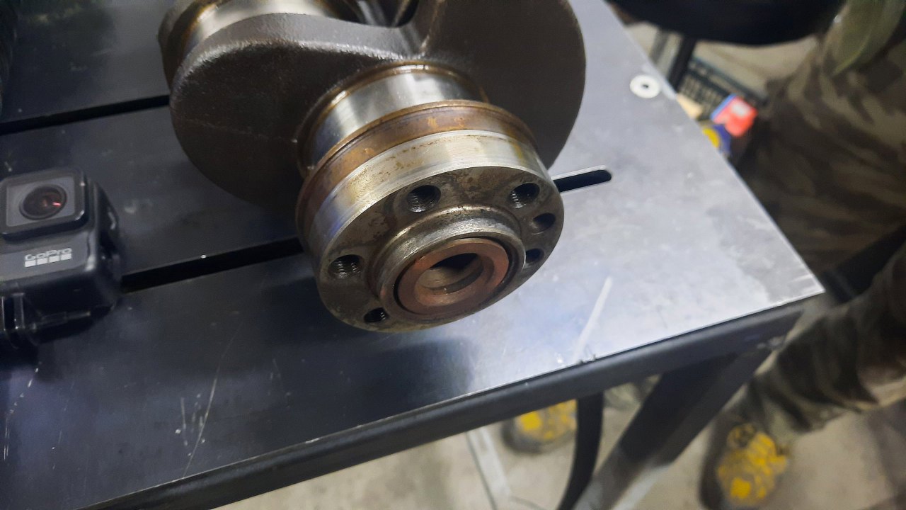 Tył wału korbowego ma widoczny wytarty ślad (rowek) po simmeringu, który zesztywniał ze starości.