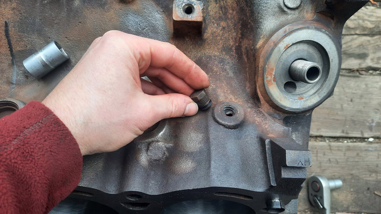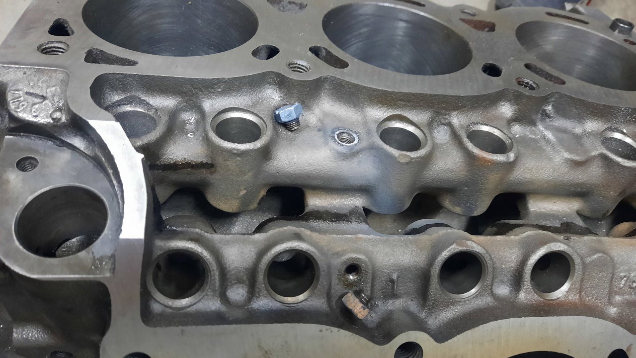 Od góry bloku korki magistrali olejowych smarujących popychacze. Nie chciały wyjść, więc trzeba było przyspawać do nich nakrętki i dopiero się poddały.