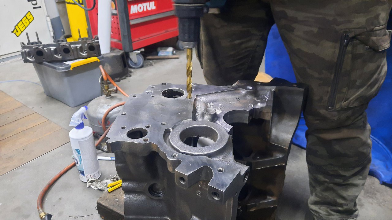 Niektóre korki z przodu silnika nijak nie chciały wyjść, a na spawanie nie było miejsca, bo były poniżej płaszczyzny bloku. Podjąłem decyzję o zmianie ich na metryczne... Czyli stare korki zostały odwiercone.