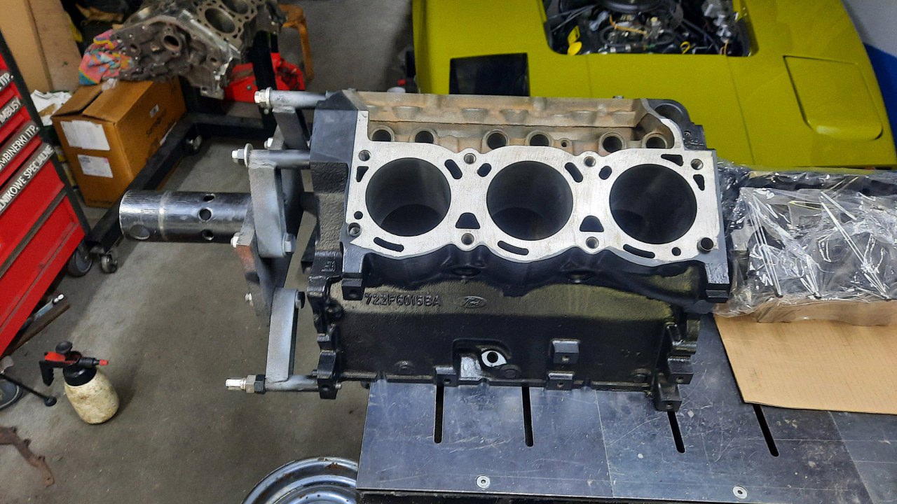 Wróćmy do bloku. Po malowaniu odkleiłem taśmę zabezpieczającą przed farbą. Blok znowu trafia na stół warsztatowy.