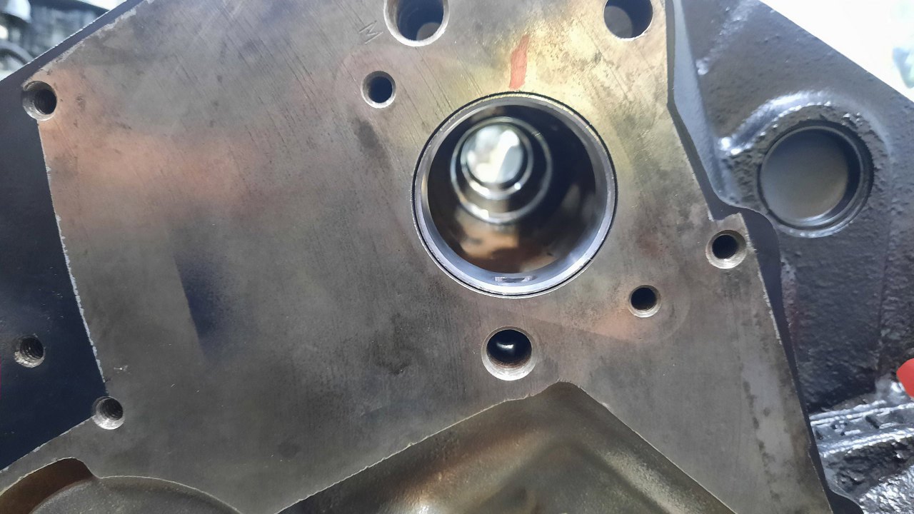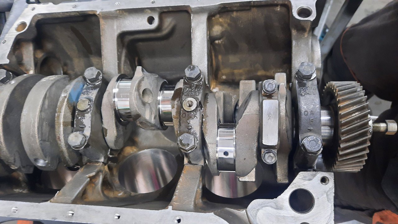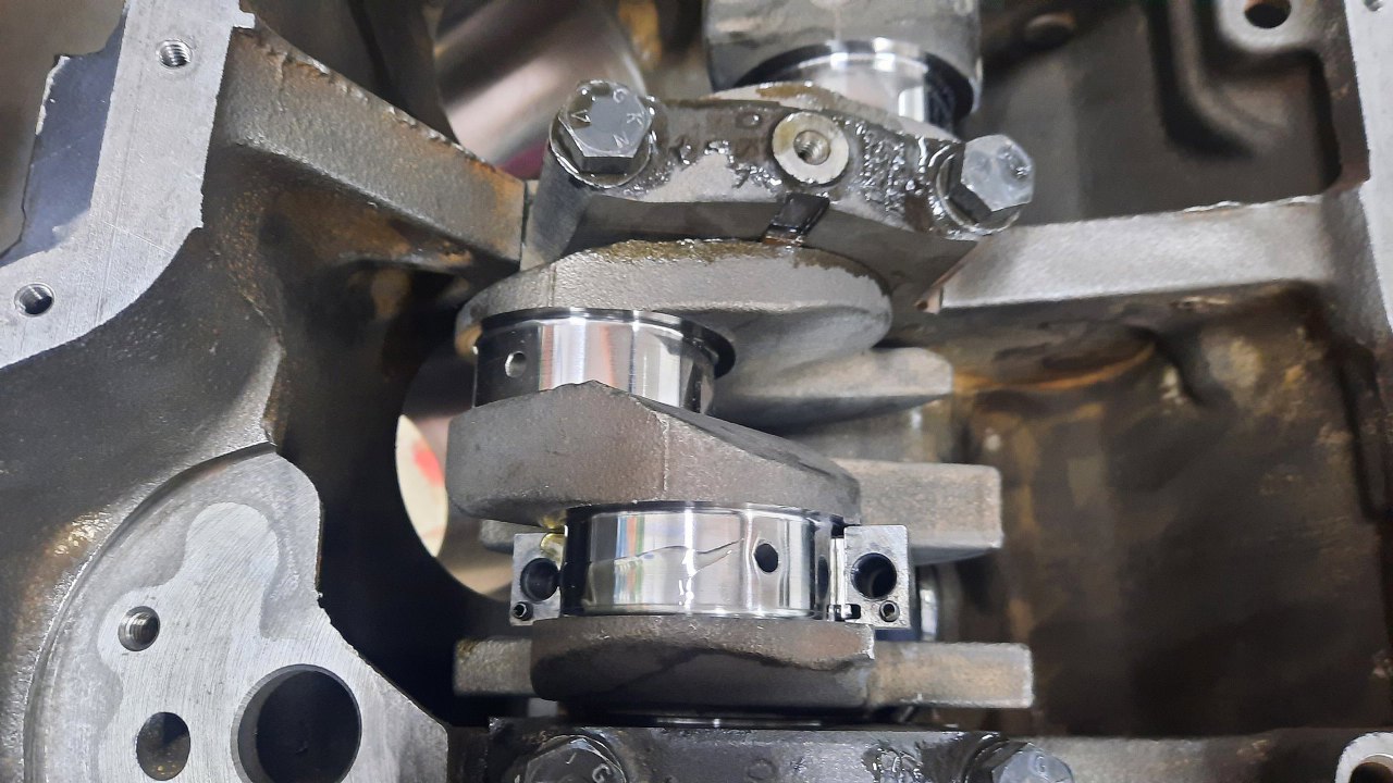 Potem smarowanie ich olejem i wał trafia na miejsce. Sam wał był tylko przepolerowany, bo jest w dobrym stanie. Tłoki, korbowody i wał zostały od nowa wyważone, mimo, że pochodzą z jednego silnika, bo między zestawami korbowód/tłok były różnice sięgające 8 gramów. Ślad wyważenia widać na jednej z przeciwwag wału - świeżo nawiercony otwór. Te nieświeże to fabryczne ważenie :).