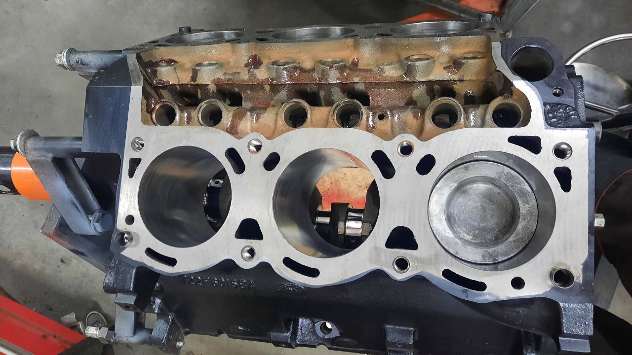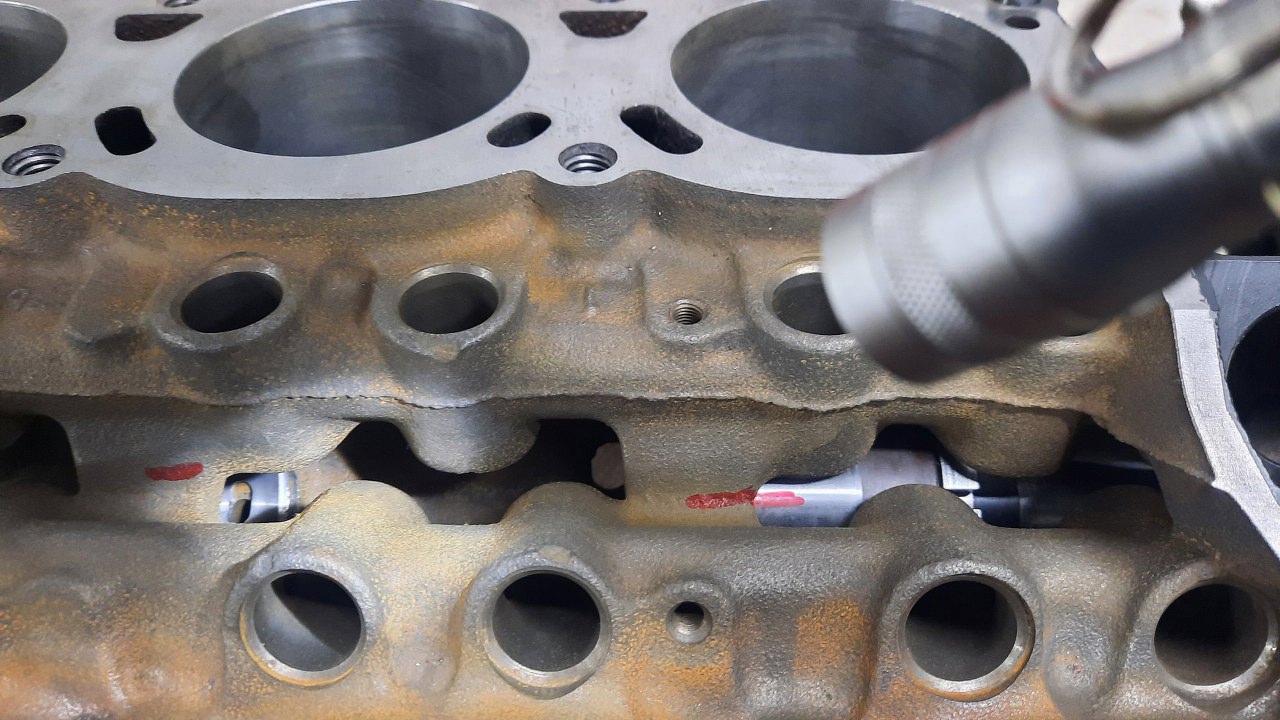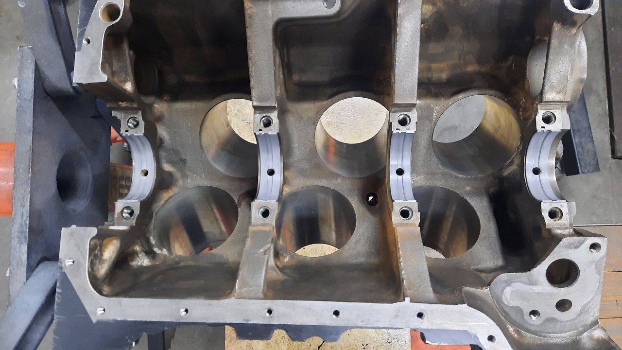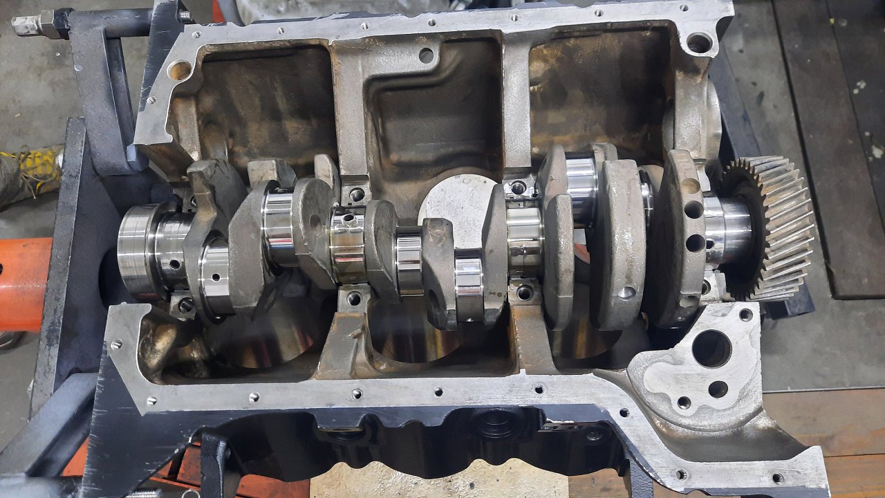 Potem smarowanie ich olejem i wał trafia na miejsce. Sam wał był tylko przepolerowany, bo jest w dobrym stanie. Tłoki, korbowody i wał zostały od nowa wyważone, mimo, że pochodzą z jednego silnika, bo między zestawami korbowód/tłok były różnice sięgające 8 gramów. Ślad wyważenia widać na jednej z przeciwwag wału - świeżo nawiercony otwór. Te nieświeże to fabryczne ważenie :).