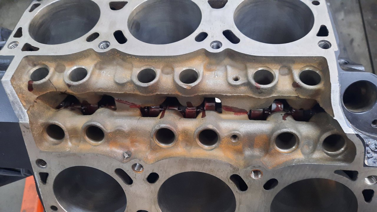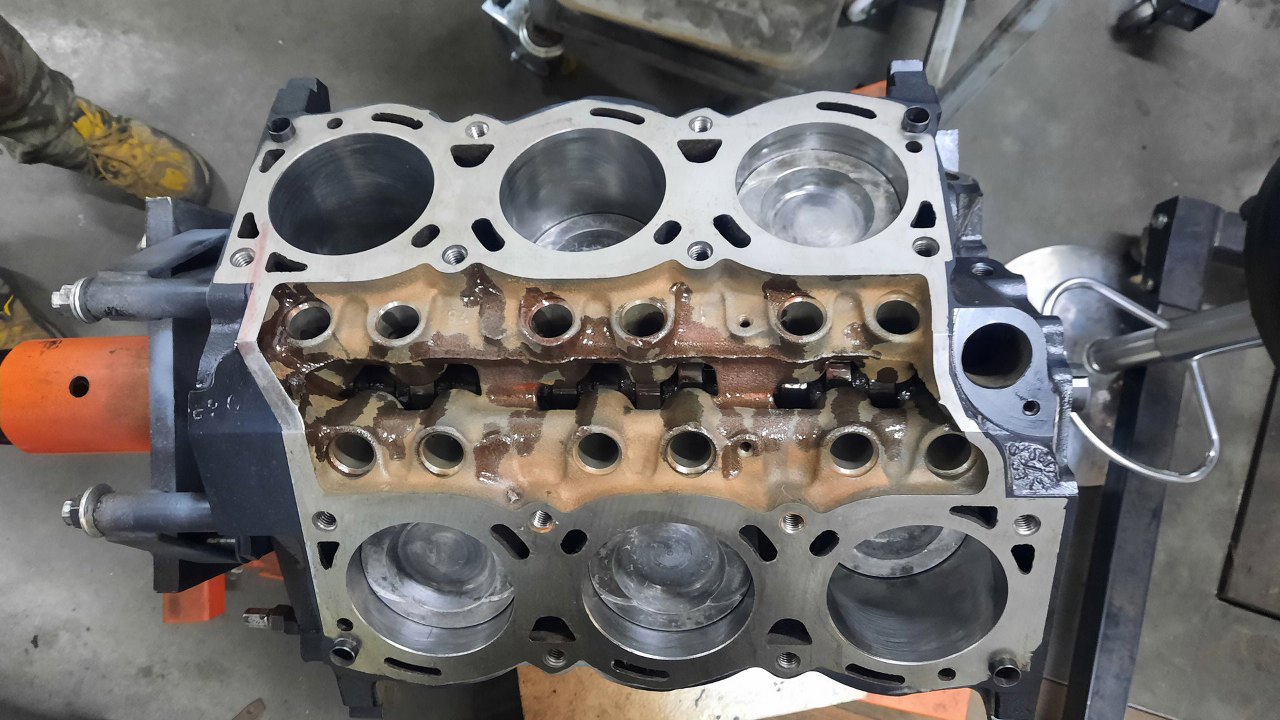 Ten silnik nie ma komór spalania w głowicy, są one zupełnie płaskie - komory spalania są w tłokach.
