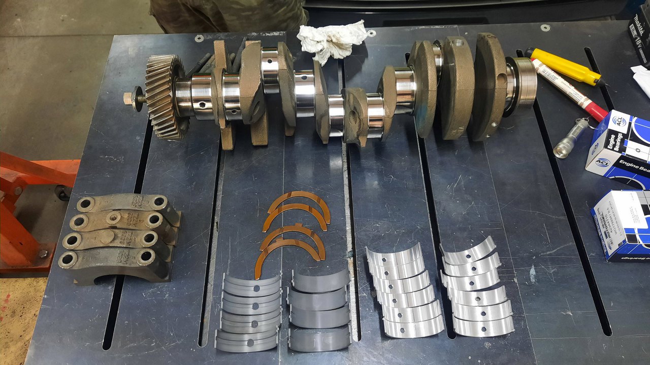 Jakiś czas później zabraliśmy się za składanie układu korbowego. Najpierw przygotowałem wał korbowy i jego panewki.