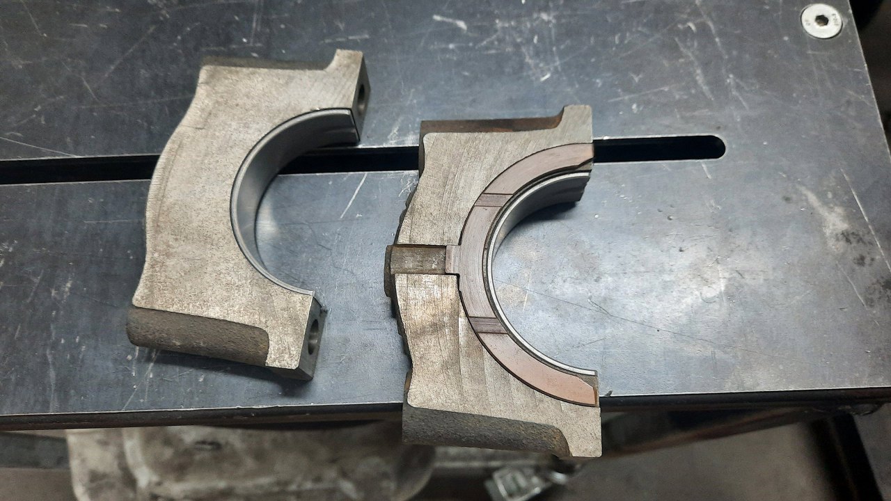 Przednia i tylna to jeszcze, ale ze środkowymi jest ciut trudniej. Chociaż w tym silniku to w ogóle je widać :). Po prawej jeszcze nie włożona panewka, po lewej widać już jedną wbitą na miejsce. Widać też kanał olejowy trafiający na otwór w panewce.