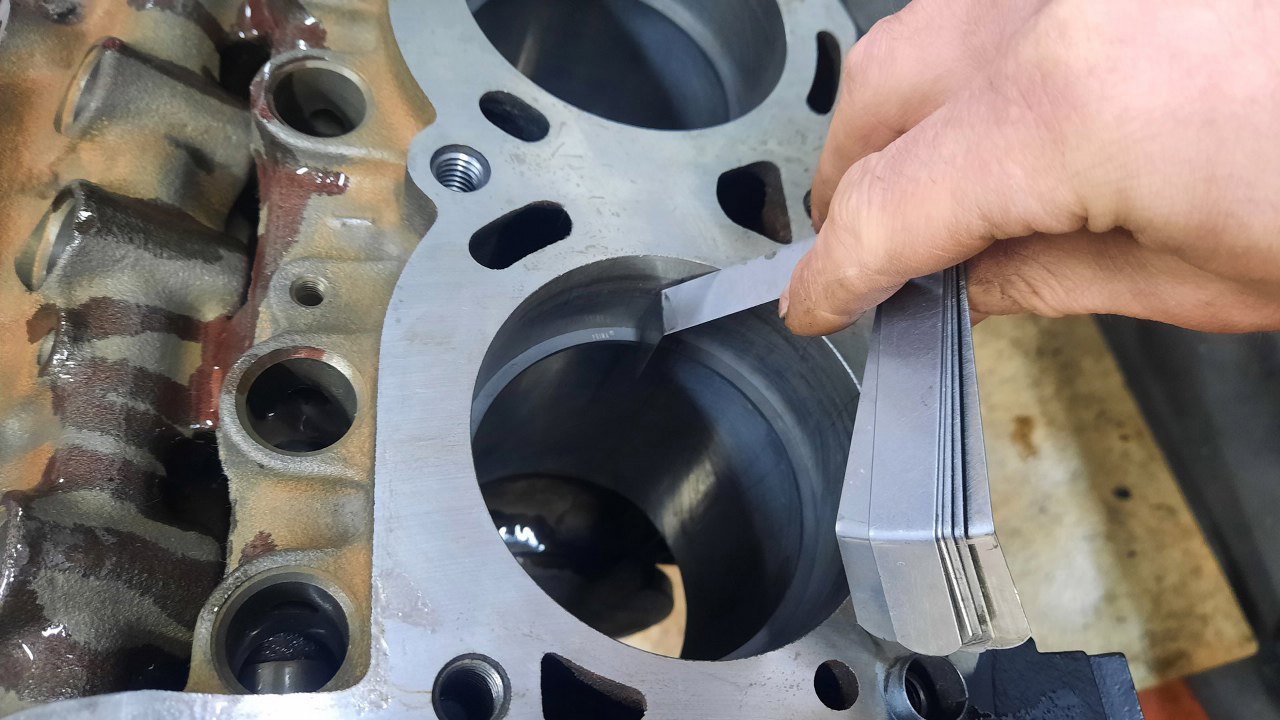 Następnie każdy z nich włożony został w odpowiedni cylinder, ustawiony prostopadle tłokiem włożonym od góry. Potem zmierzyłem luz pierścienia i praktycznie wszystkie, łącznie z olejowymi, musiałem szlifować, bo miały za małą przerwę.