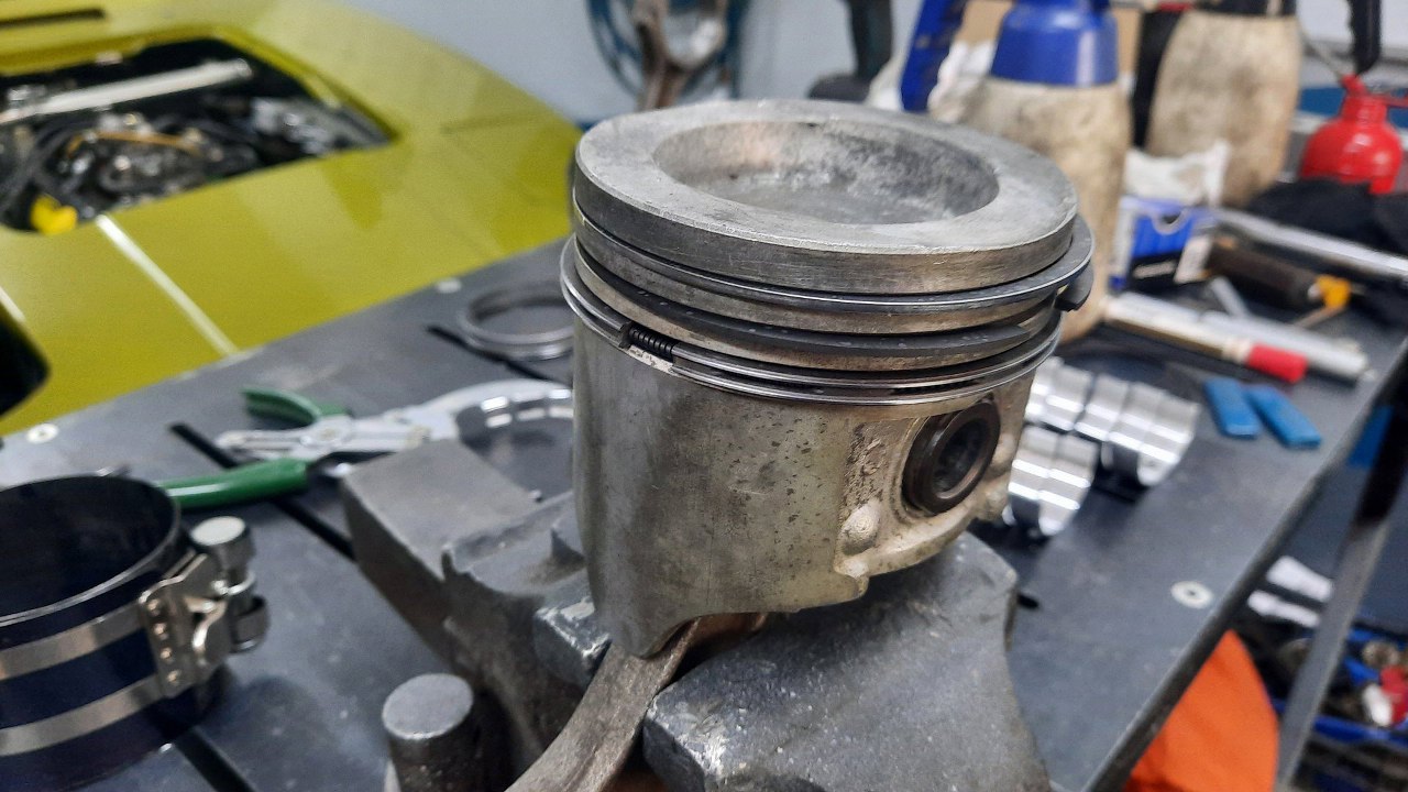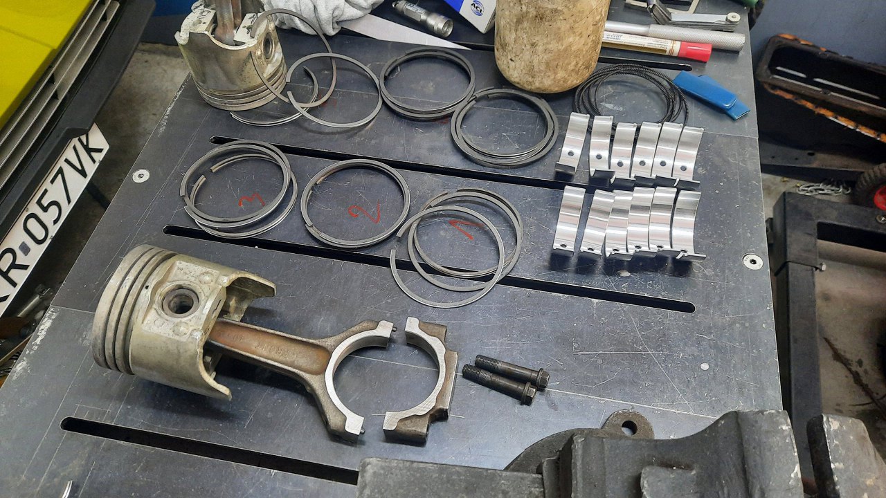 Jak już wszystkie pierścienie były gotowe, wyciągnęliśmy (Piotrek pomaga przy silniku) tłoki i zacząłem je szykować do włożenia.