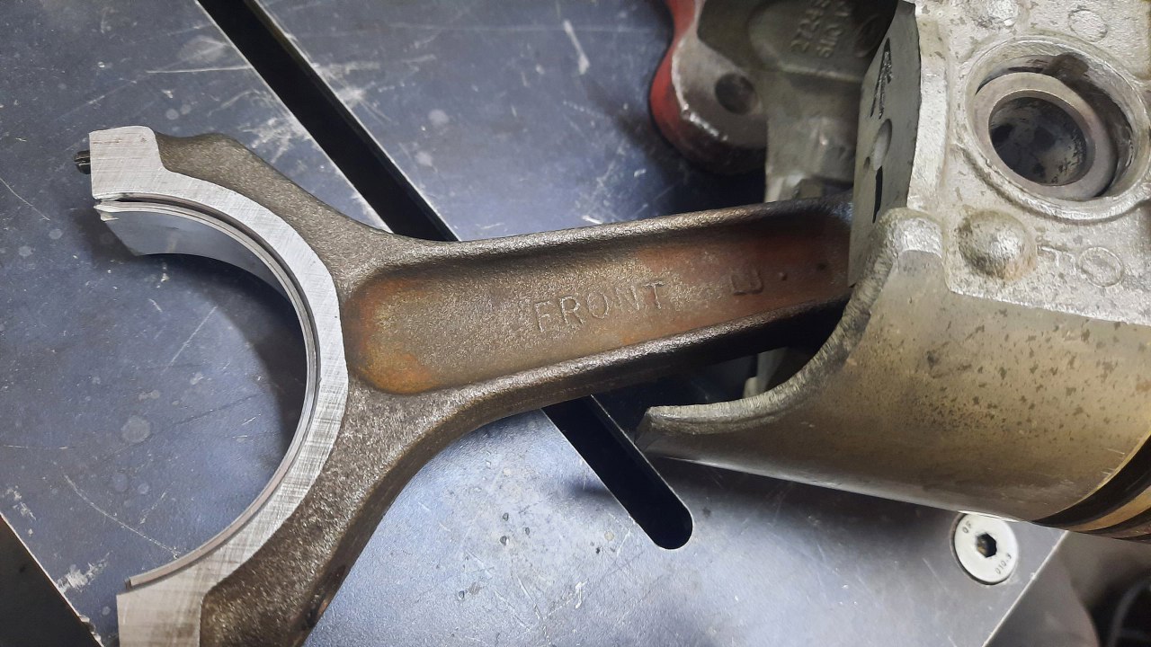Szukałem przez chwilę kropki czy kreski na denku tłoka, żeby zobaczyć gdzie jest jego przód. Brytyjczycy jednak nie są aż tak dyskretni... Na tłoku jest odlana litera "F" (widoczna po prawej), a na korbowodzie (bo w końcu jest na nim tyle miejsca, że dziś to nawet reklamę tam by można było wcisnąć) jest odlany cały napis "FRONT". To jest tak niedyskretne, że na początku tego nawet nie zauważyłem, bo nie miałem pojęcia, że tu coś sensownego może być napisane :).