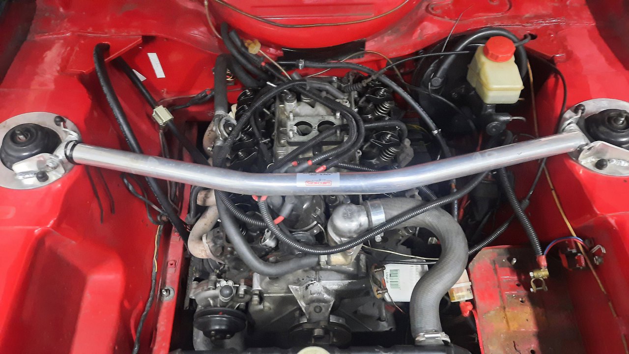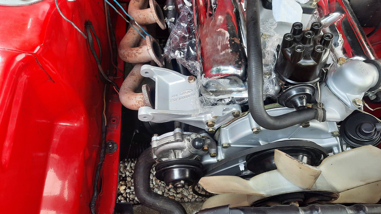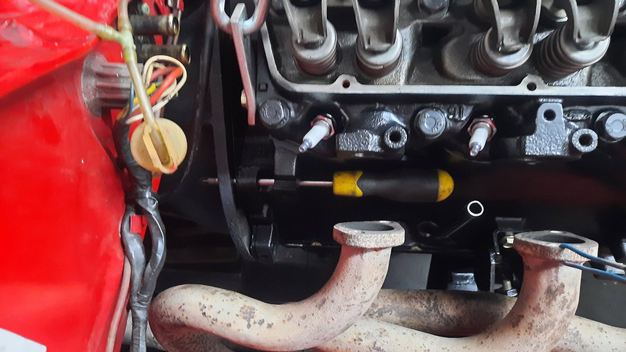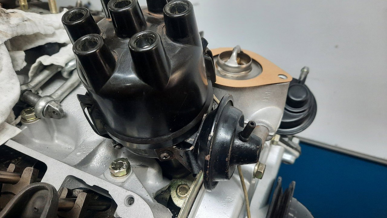 W międzyczasie ja przełożyłem kilka rzeczy pomiędzy silnikami. Włożyłem na miejsce aparat zapłonowy. Potem też termostat widoczny w tle.