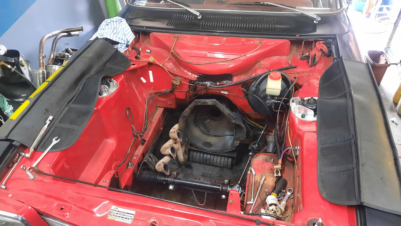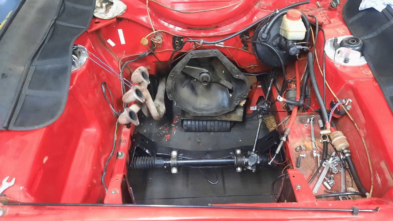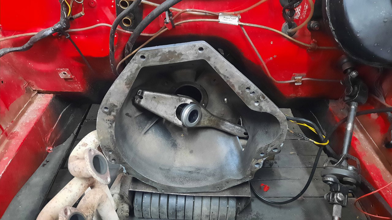 W środku jeszcze siedzi stary silnik, taki sam. Osprzęt już z niego Piotrek nieco zdjął. Zamiast skrzyni jest sama obudowa, bo skrzynię też zaczęliśmy robić, ale to za chwilę opowiem. Obudowa jest przylręcona do silnika, żeby się to wszystko jakoś w samochodzie trzymało.