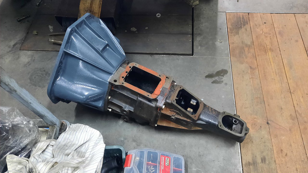 No i tu zaczęły się schody, bo Piotrek nagle zobaczył, że belka zawieszenia nie pasuje jakością wykończenia do reszty, więc zapragnął ją oczyścić, podprostować i pomalować. Nic w tym złego nie widzę, ale zajęło to chwilkę i nie mogliśmy od razu włożyć silnika. I tak dzieje się to wciąż tego samego dnia - belka zawieszenia jest jeszcze dość mokra, bo musimy silnik dziś włożyć. Belka pewnie będzie docelowo zmieniona, ale nawet jeśli nie, wygląda o niebo lepiej. Przykręciliśmy z powrotem obudowę skrzyni na miejsce, bo skrzynia jeszcze nie jest gotowa. Ponieważ ta skrzynia ma dzwon przykręcany nie od środka, a od zewnątrz, to postanowiłem, że dzwon zostanie już przy silniku na stałe. Dlatego od razu założona została łapa sprzęgła.