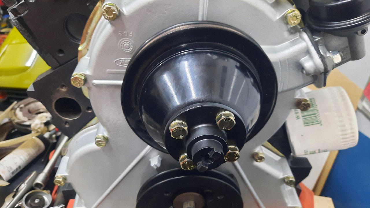 Przykręciłem koło pasowe wiatraka. Oryginalnego wiatraka już nie ma, jest taki dziwny adapter, do którego przykręcony jest wiatrak od jakiejś toyoty, czy coś. Na razie musi zostać, bo nie mamy nic innego na zamianę.