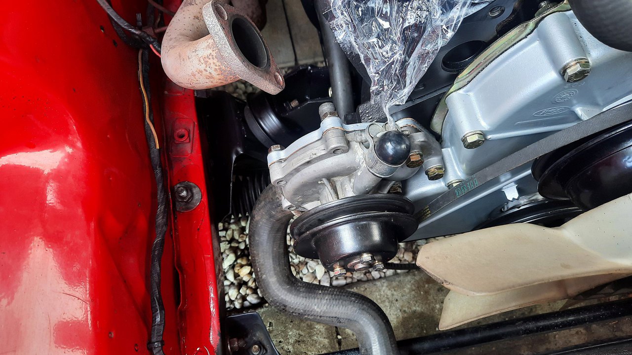 Przykręciłem pompę wody na miejsce i podłączyłem dolny wąż chłodnicy. Tak, chłodnica też już jest na miejscu.