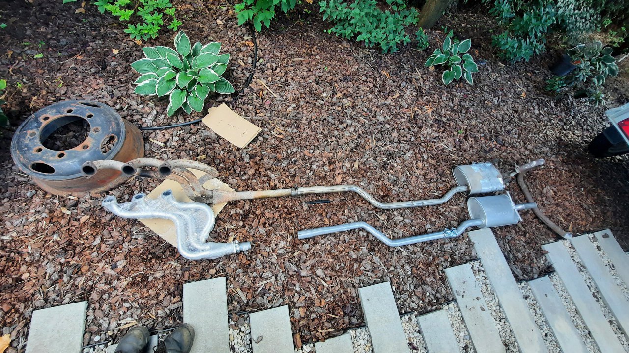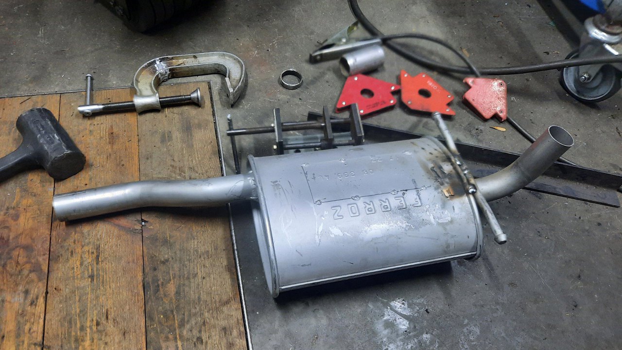 Skrzynia biegów gotowa, można dalej działać w stronę zakończenia projektu. Piotrek kupił w międzyczasie nowy wydech środkowy i kolektory, bo stare były już w słabym stanie. Niestety, tłumik końcowy jest niedostępny w ogóle i trzeba będzie go docelowo dorobić. Póki co zrobimy tyle, ile się da. Piotr wyciągnął ostatni kawałek wydechu, który został jeszcze w samochodzie, czyli prawą stronę. Porównaliśmy to do nowych elementów... No trochę brakuje :).