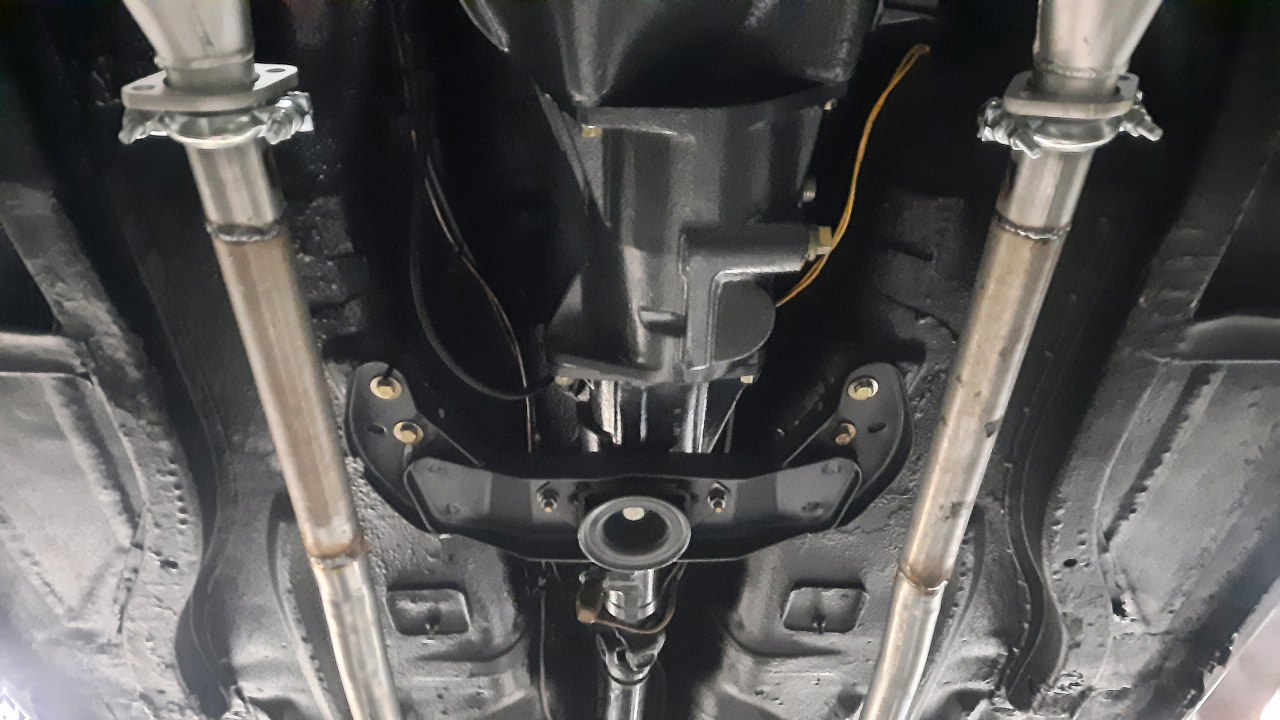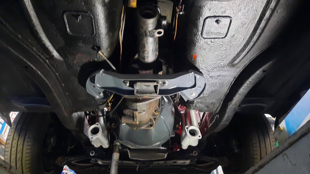 Potem przykręciłem miskę, belkę zawieszenia itd. Podłączyłem linkę prędkościomierza, czujnik wstecznego, przykręciłem wał napędowy. Przyszła pora zająć się wydechami. Po prawej widać kawałek do łączenia rur, który kupił Piotr. Po lewej rura, wycięta ze starego wydechu.