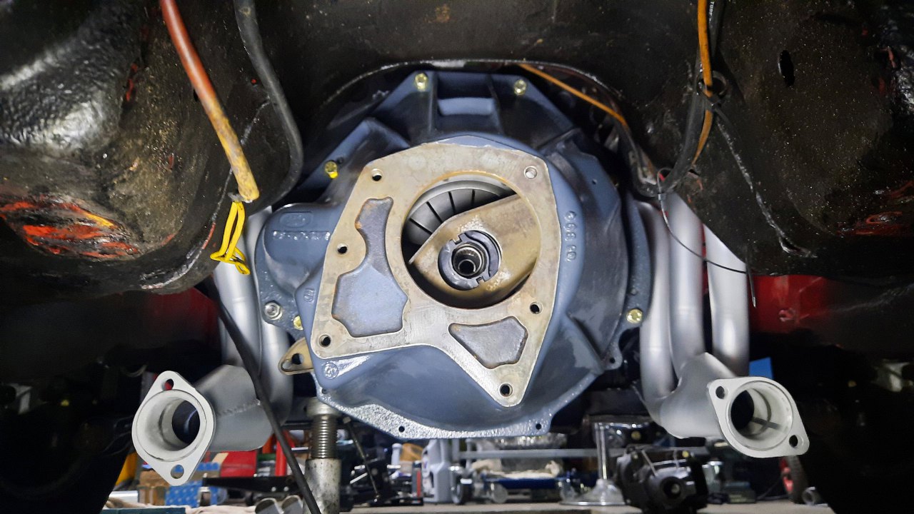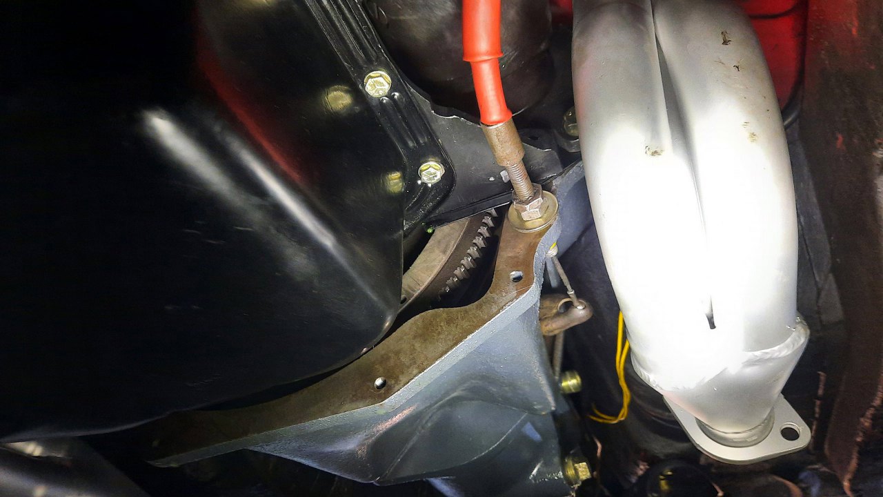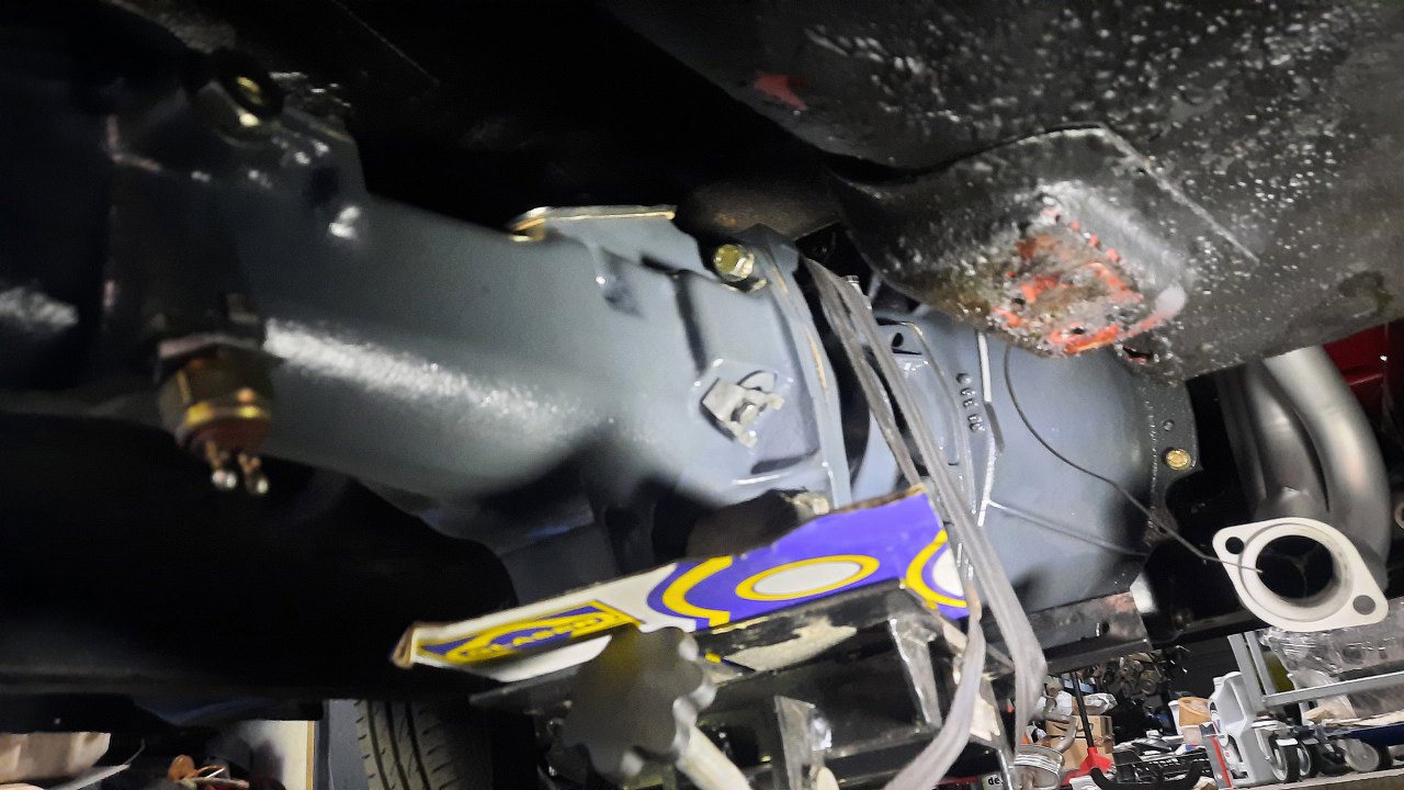 Potem udało się wcisnąć samochód na kanał. Muszę założyć skrzynię biegów. Póki co silnik ma przykręconą pustą obudowę skrzyni, żeby nie wisiał tylko na poduszkach z przodu. Tu w ogóle jest wyspawana ciekawa łapa skrzyni :).