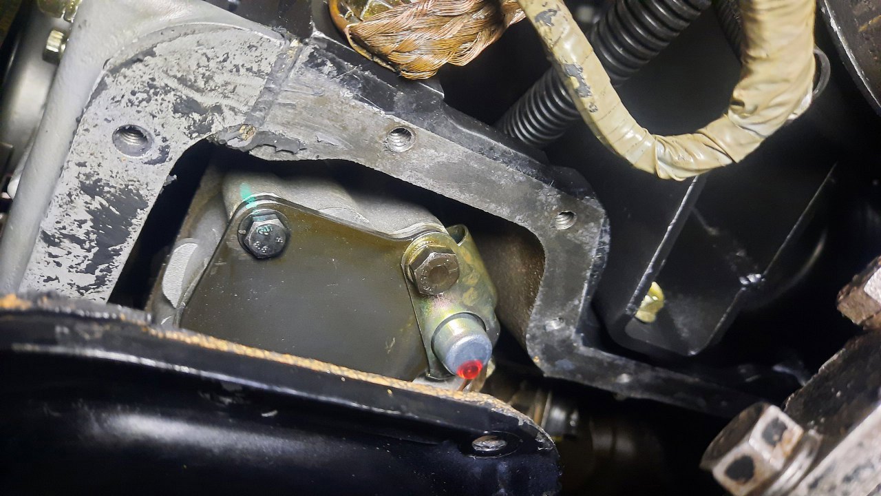 Jakoś niedawno Piotr znalazł też jedną część, której nie byliśmy pewni. Była ocynkowana, więc raczej zewnętrzna... Nie. Widzisz tą blaszkę w prawej górnej śrubie pompy oleju? To ta... Raczej nie jest dość istotna, to tylko osłonka wylatującego z zaworka nadciśnieniowego pompy oleju, ale... No jak była, to powinna być.