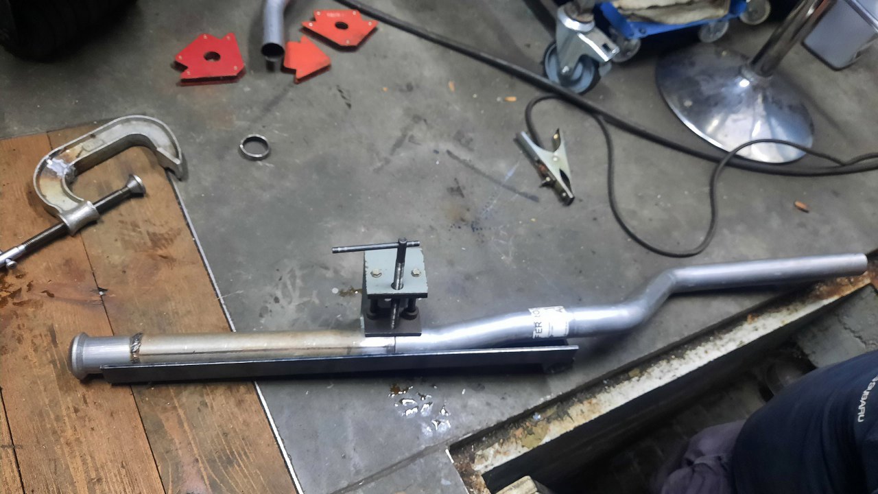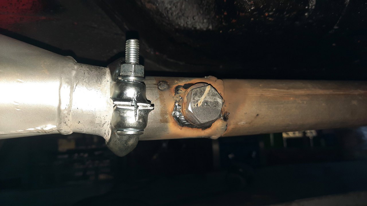 Przyspawałem je kilka cm dalej. Przesuwa mi to środkowy wydech o tyle do przodu. Tu na razie tylko drobne spawy, żeby się to trzymało. Spawanie na gotowo będzie dopiero na końcu, jak będziemy pewni, że to w ogóle pasuje.