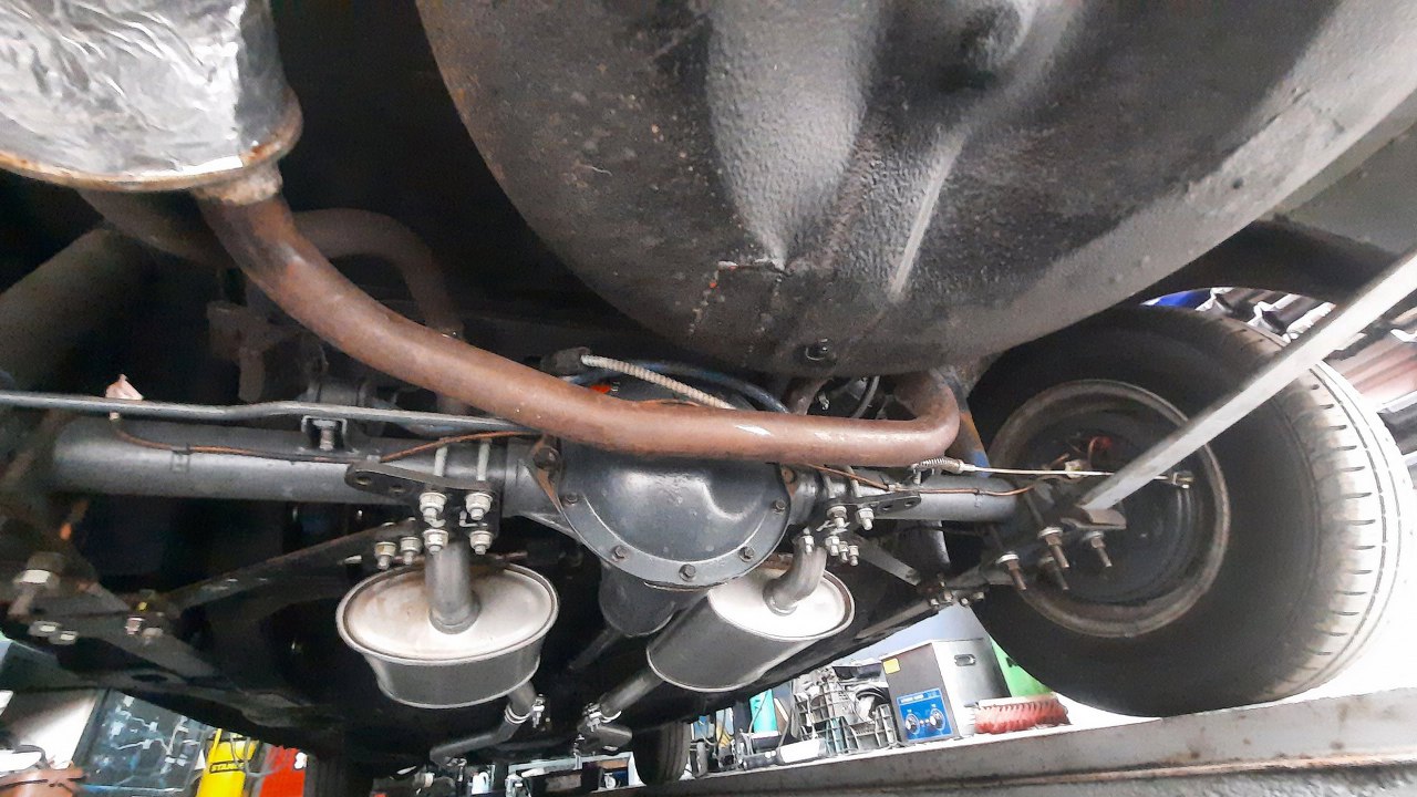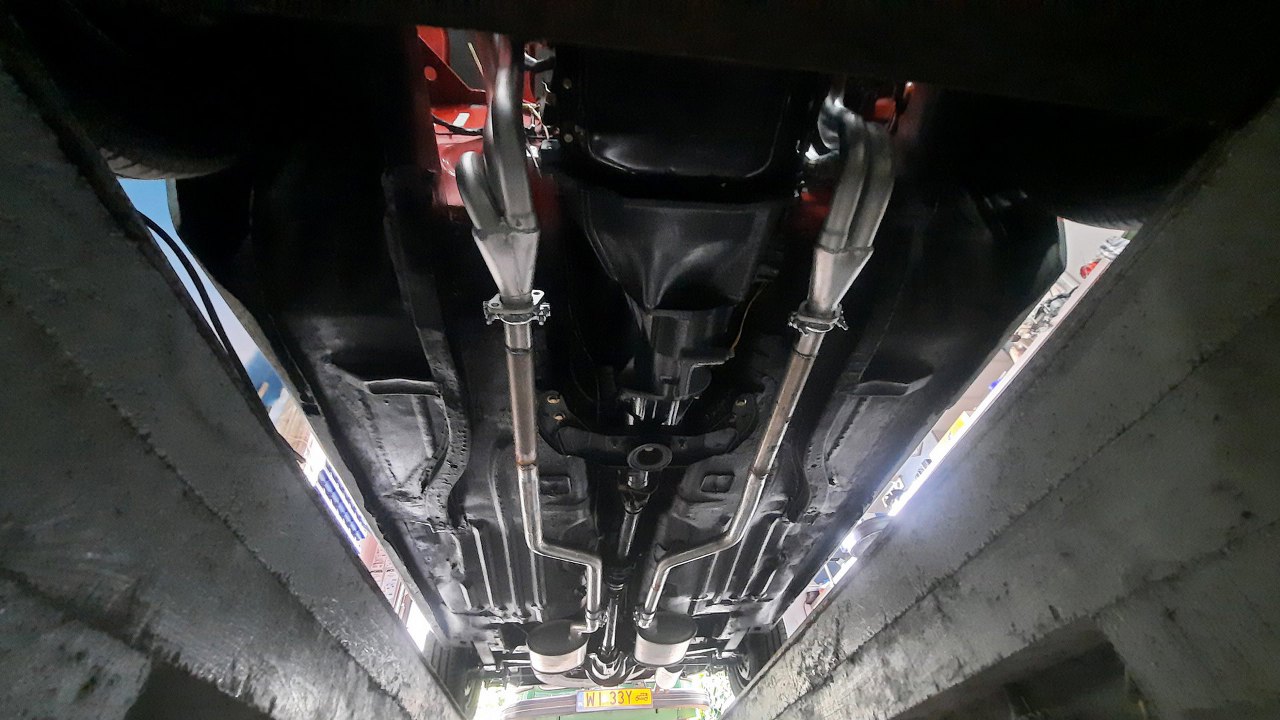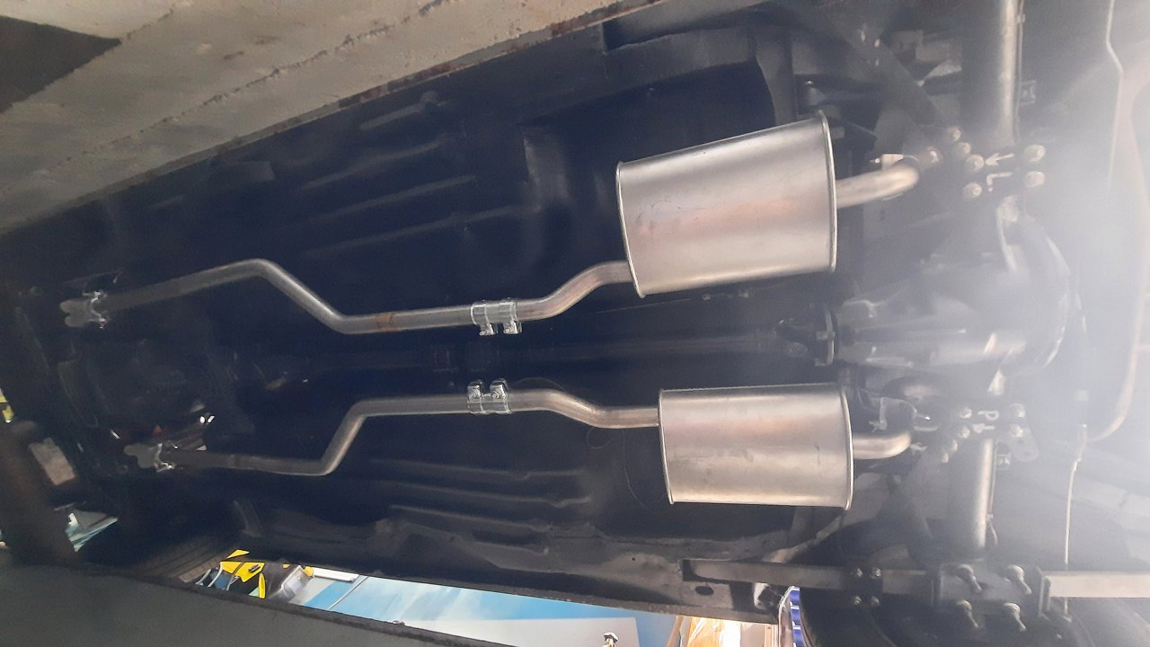 Wyszło nawet nieźle - wydech jest symetryczny, dość wysoko pod podłogą, na tej samej wysokości. Dzięki przesunięciu go do przodu, nie uderza już prawie w most.