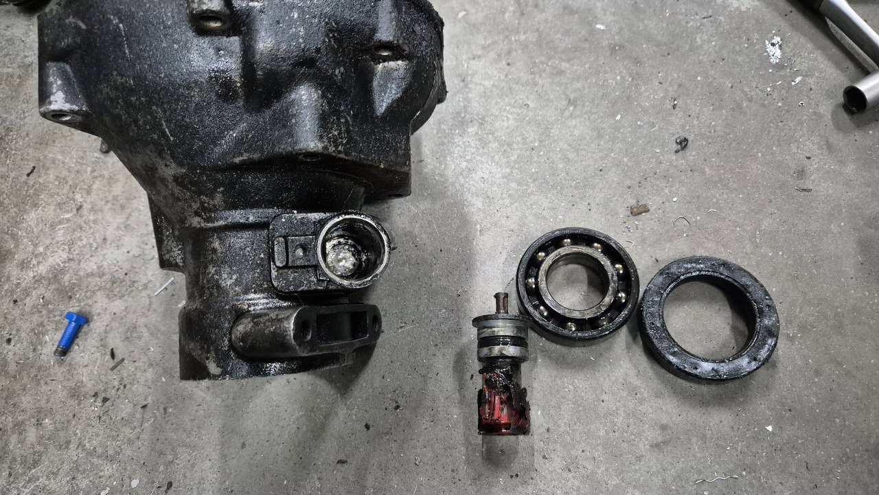 Z ogona wyciągnąłem uszczelniacz, łożysko i nędzną resztkę napędu prędkościomierza. Zębatka jest tu stopiona, ciekawe, co jej się stało.
