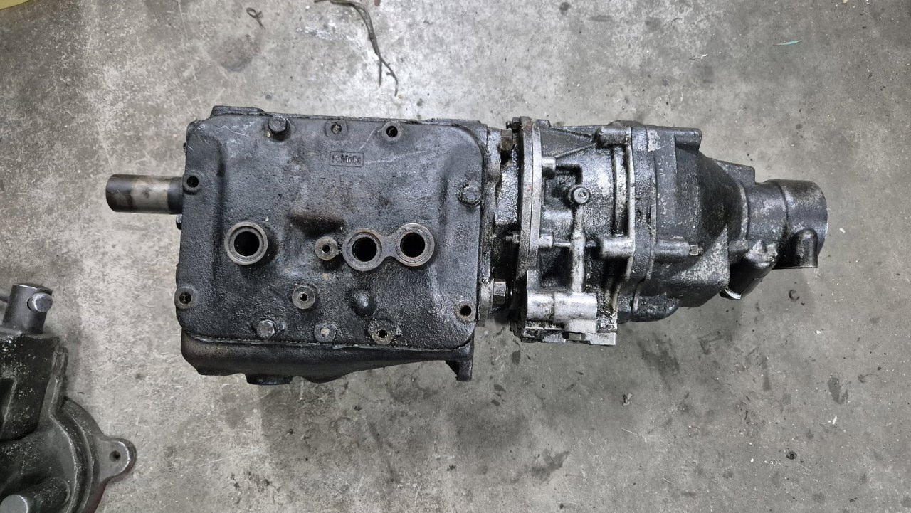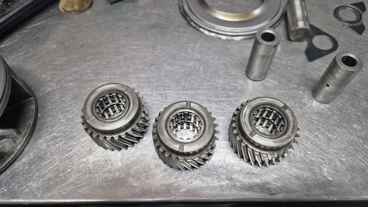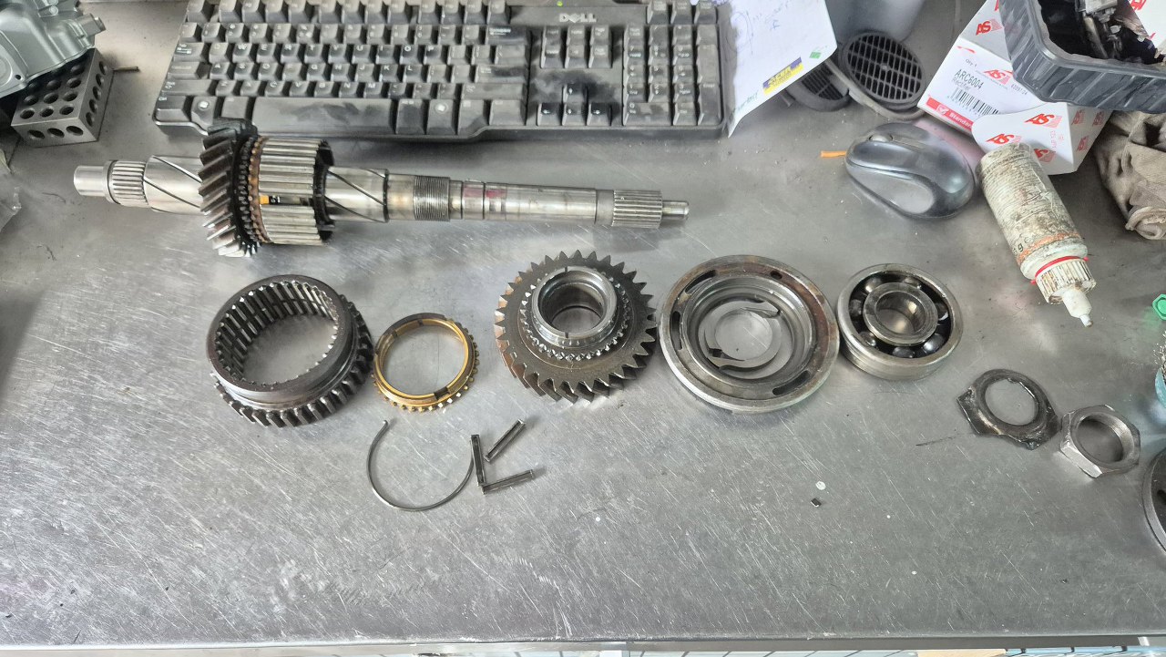 Pozwoliło mi to na zdemontowanie reszty przekładni. Tu zdjęte łożysko tylne i koła zębate pierwszego i wstecznego biegu.