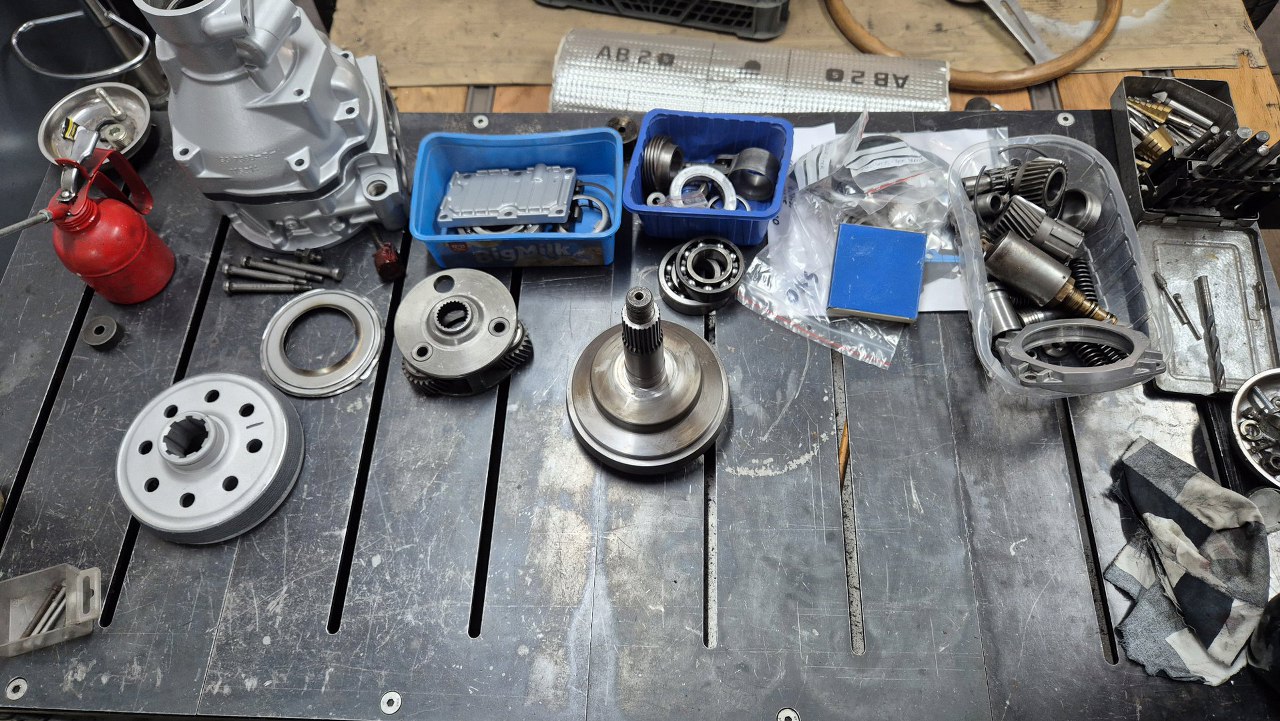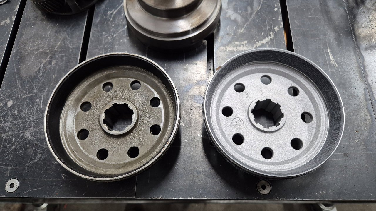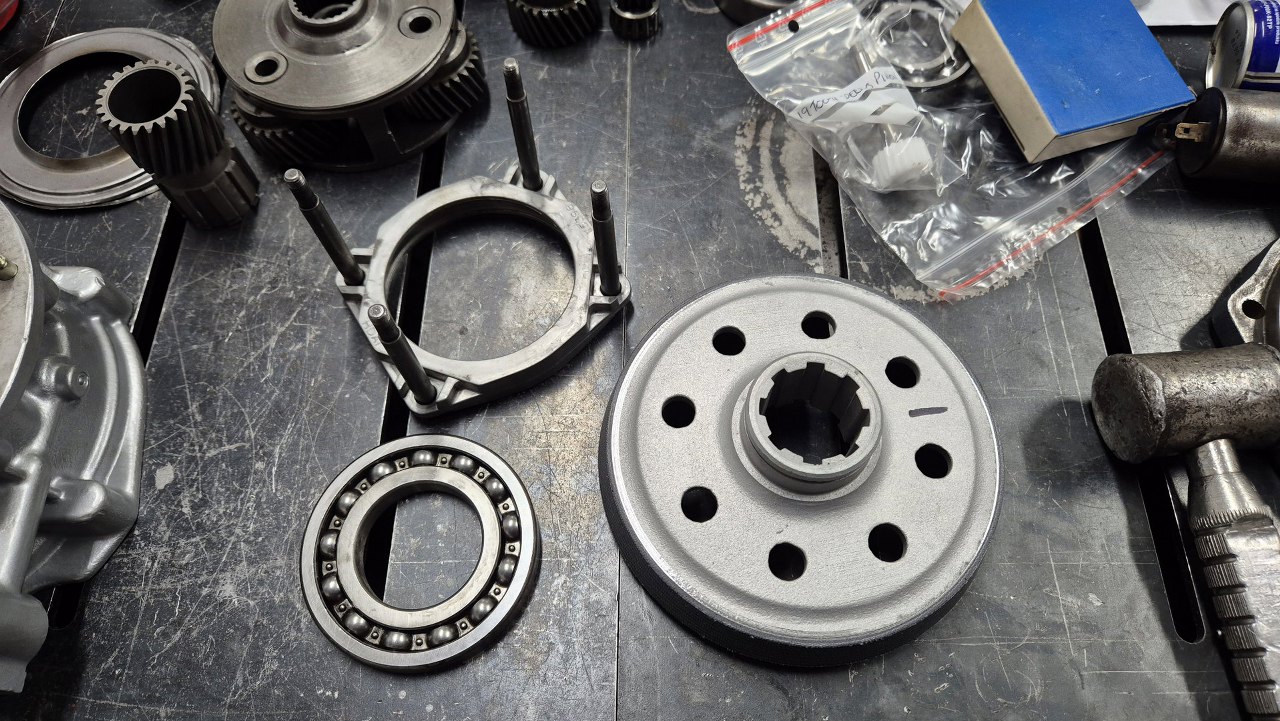 Dotarły do mnie zamówione części do overdrive, więc mogę i to złożyć. Porównałem odnowiony bęben ze starym, wygląda na taki sam, tylko ma naprawdę ładne, nowe okładziny cierne. Stary mogę więc z czystym sumieniem odesłać.
