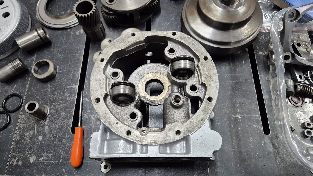 Na dół kładę posmarowaną olejem podkładkę oporową. W głębi widać tulejkę łożyskującą wałek wychodzący ze skrzyni.