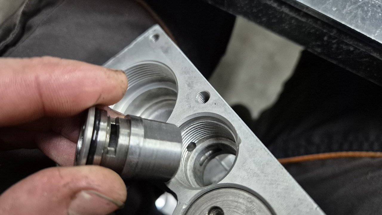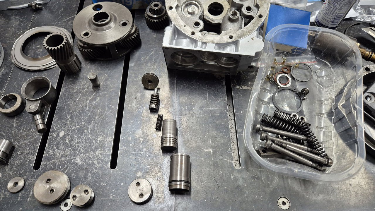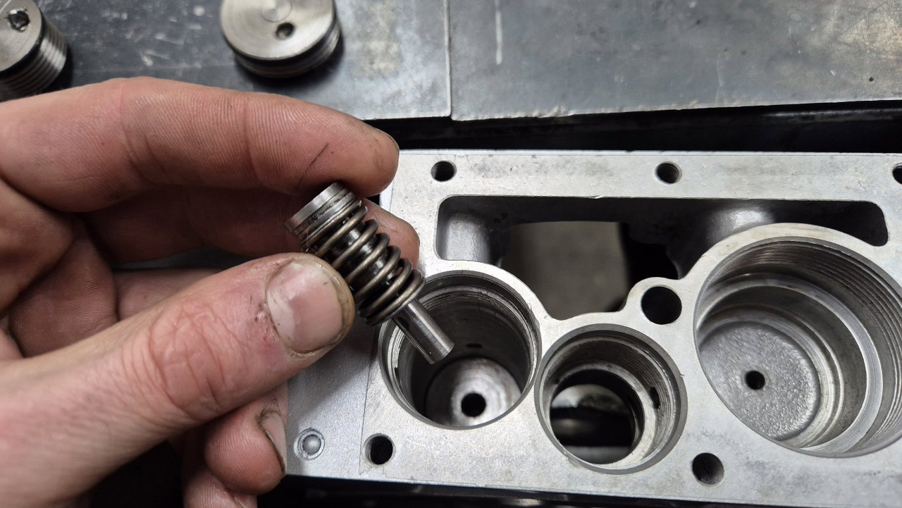 Po włożeniu tłoczków zajmę się zaworkami i resztą rzeczy wkręcanych od dołu obudowy. Tu główny zawór sterowany elektrozaworem wkręcanym z zewnątrz. Ułożyłem części w kolejności montażu.