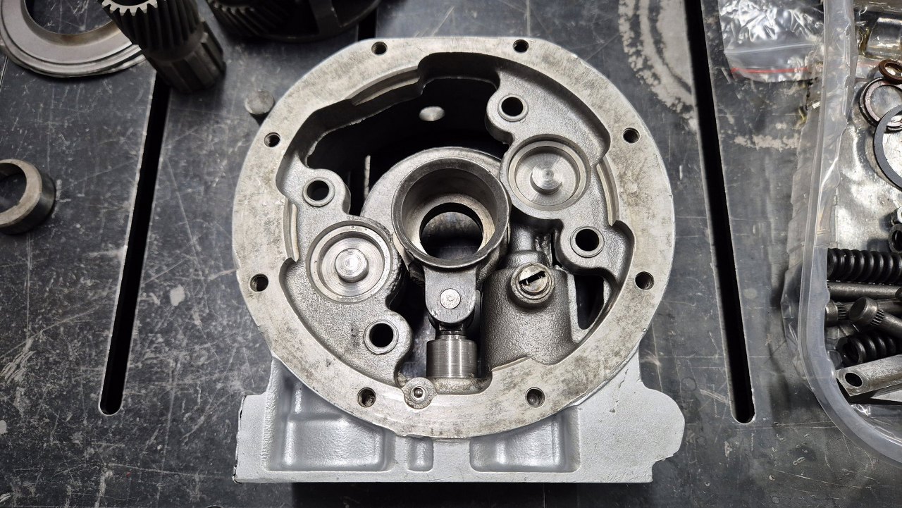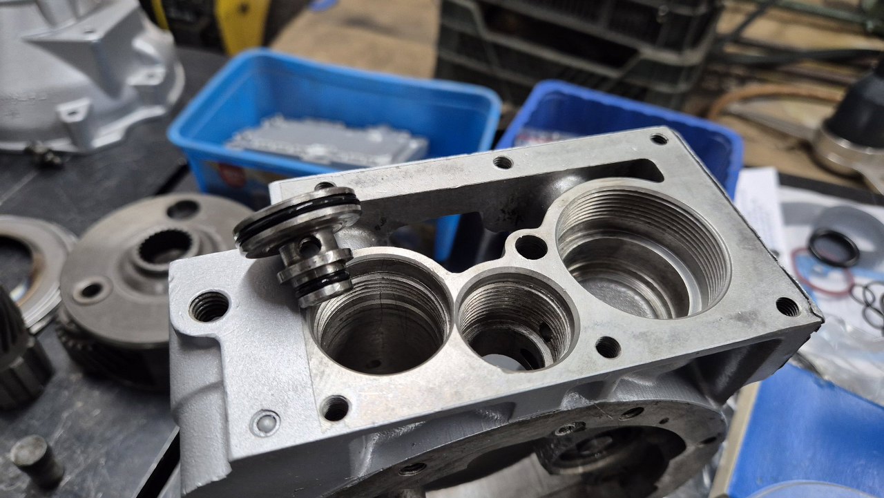 W korpus pompy wkładam z tej strony tłoczek zamocowany do części ślizgającej się po krzywce na wałku wyjściowym skrzyni. Krzywka będzie założona później.
