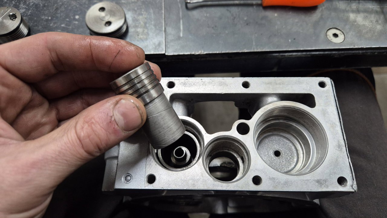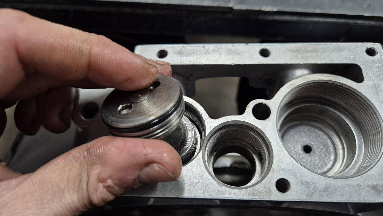 Najpierw mały tłoczek. Trzeba go dobrze włożyć, bo ciężko na miejsce wchodzi z nowymi uszczelkami.