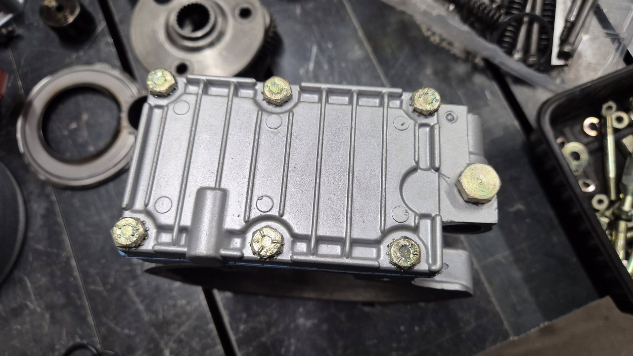 Pora to zamknąć. Wkręciłem szpilki mocujące. Na to jeszcze oczywiście musi iść uszczelka. Do środka trafią satelitki i można całość skręcać.