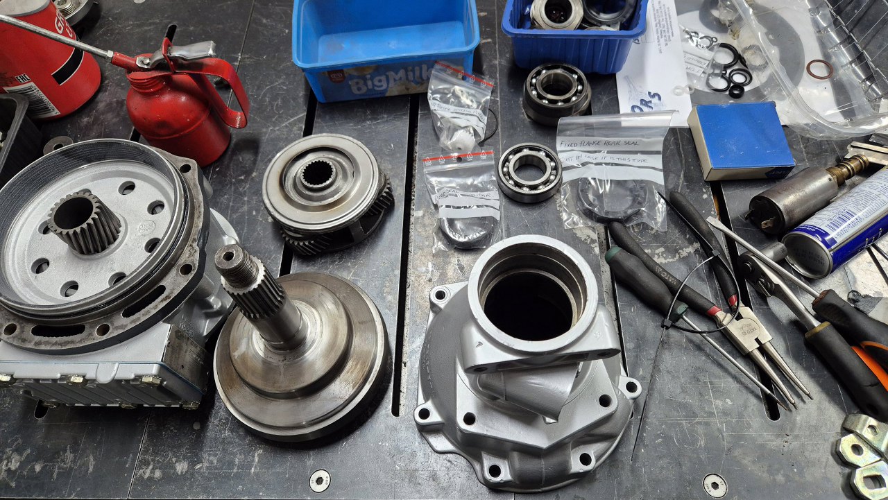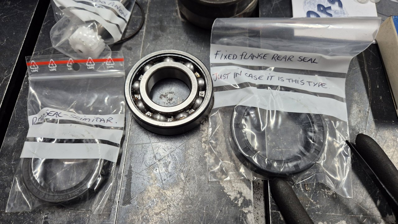 Do ogona mam dwa nowe łożyska wałka wyjściowego. W zestawie uszczelek przyjechały dwa uszczelniacze tylne. Opis na większym, pasującym do tej skrzyni jest świetny. Nic bardzij brytyjskiego dziś nie zobaczysz :).