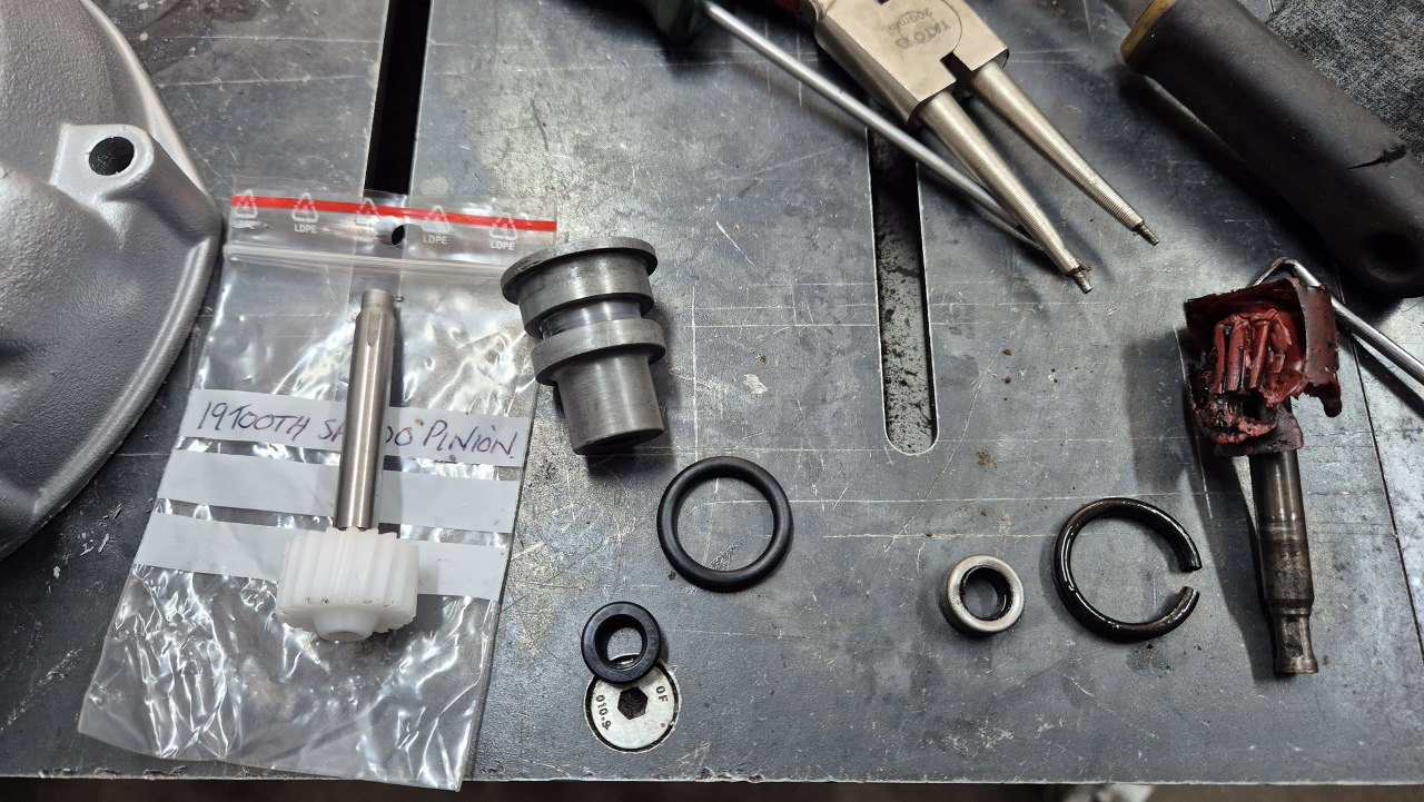Od razu też złożę resztę napędu prędkościomierza. Sprawdziliśmy wcześniej z Piotrem, czy ślimak ma tą samą ilość zębów, co w jego obecnej skrzyni, a następnie policzył, ile zębów ma zębatka. Dzięki temu zamówiliśmy właściwą dla jego auta nową zębatkę.