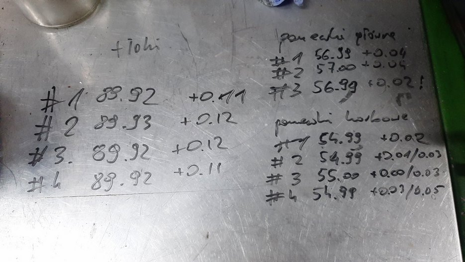 A tu mamy wyniki pomiarów. I na tłokach i na panewkach w tym silniku mają być luzy pomiędzy 0.04mm a 0.06mm. Na tłokach mamy zdecydowanie za duży luz - kwalifikują się do szlifu na nadwymiar. Z kolei wał ma gdzie niegdzie za ciasno, czyli trzeba poprawić otwory w bloku i korbowodach.
