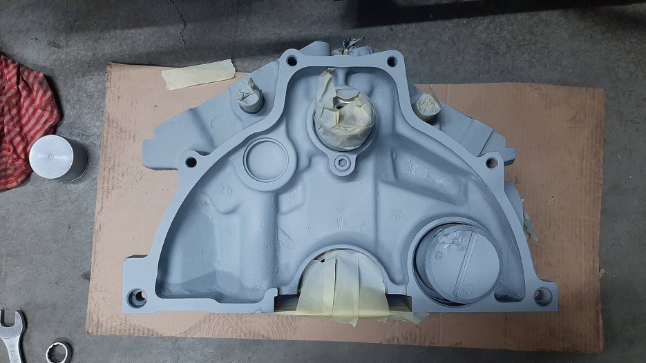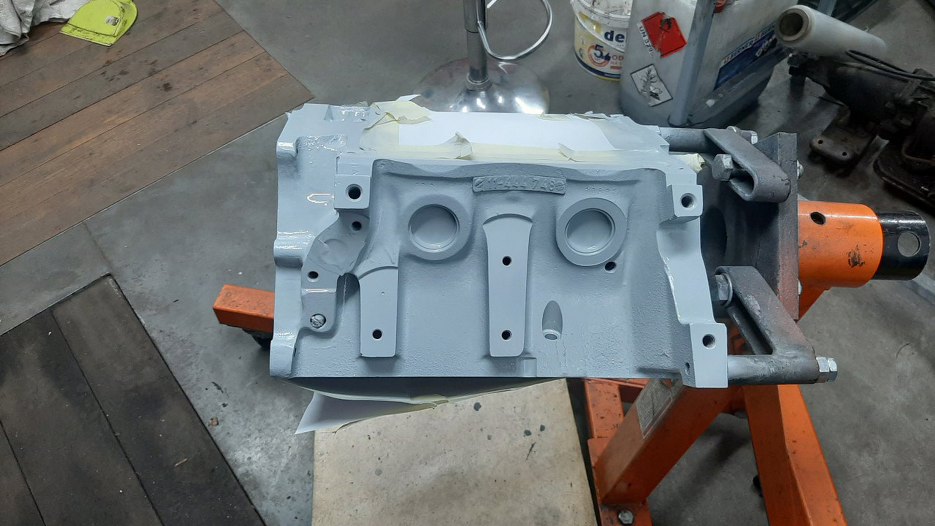 Po przeschnięciu tylnej strony bloku powiesiłem go na stojaku i pomalowałem dookoła podkładem.
