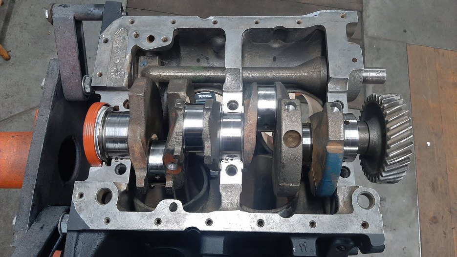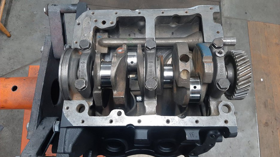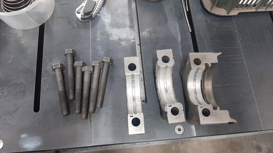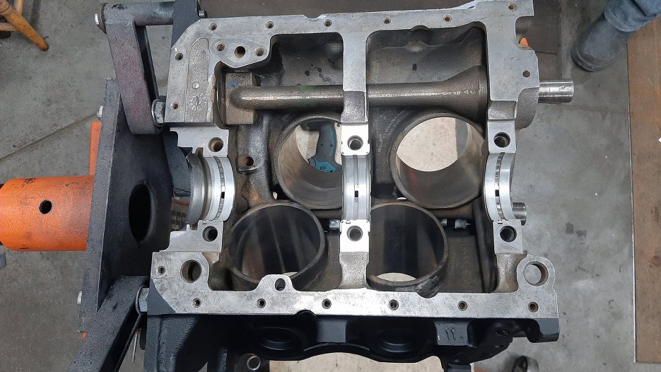 Po włożeniu na miejsce wałka wyrównoważającego założyliśmy blok z powrotem na stojak. Teraz zamontowałem panewki główne.