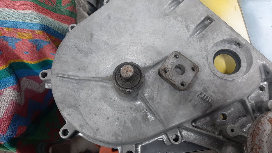 Głowice widać w tle - zostały po myciu odtłuszczone i oklejone do malowania. Chcę jeszcze przygotować pokrywę rozrządu. Zdejmuję flanszę wiatraka chłodnicy z ośki - ta flansza będzie oddana do ocynku.