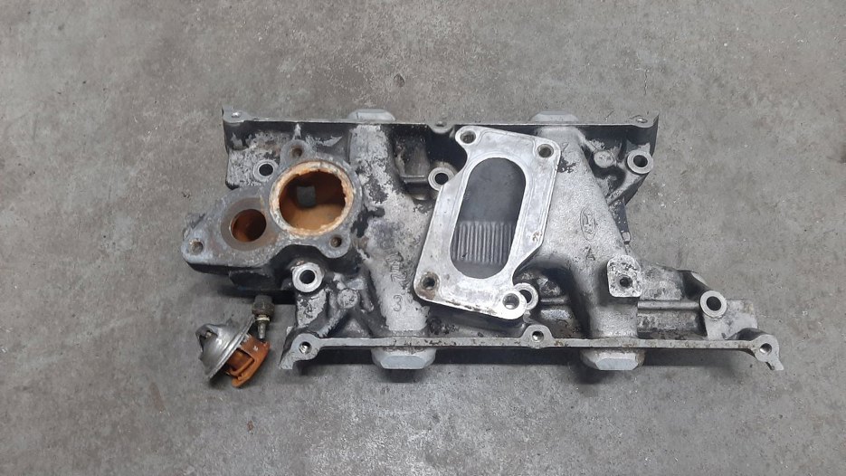 Wyciągnąłem z gratów też kolektor dolotowy. Wykręciłem z niego szpilki gaźnika i wyjąłem termostat. I... nie będę tego mył. Za dużo zakamarków. Wysyłam z innymi częściami do szkiełkowania.
