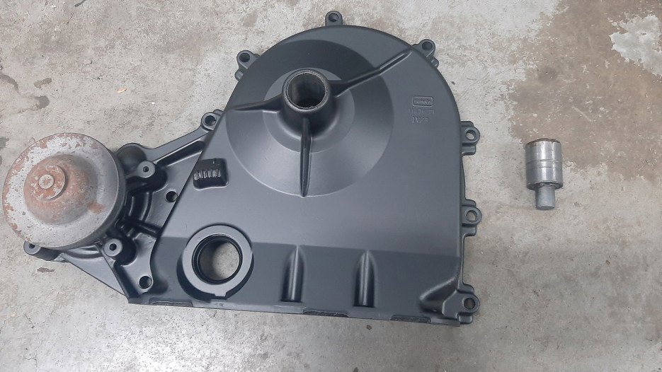 Mam też już pomalowaną pokrywę rozrządu. Stara pompa wody jest użyta jako zaślepka :). Wyjąłem z pokrywy na prasie łożysko wiatraka.