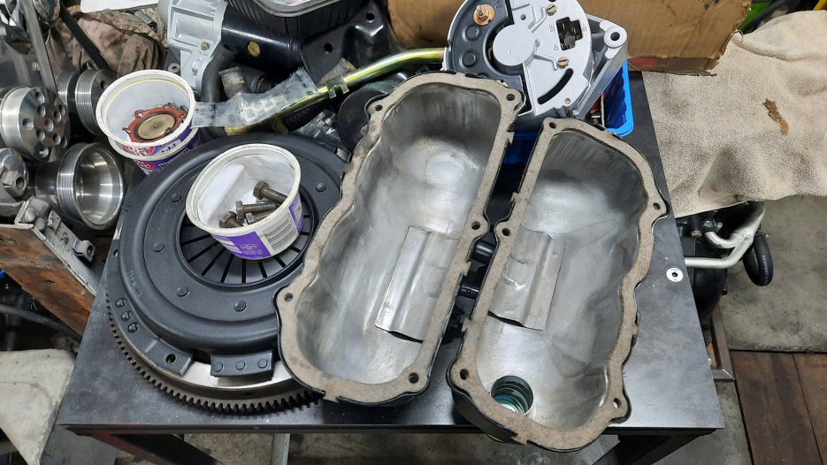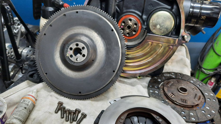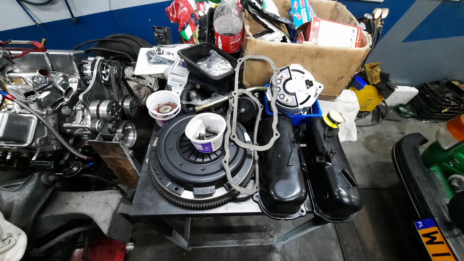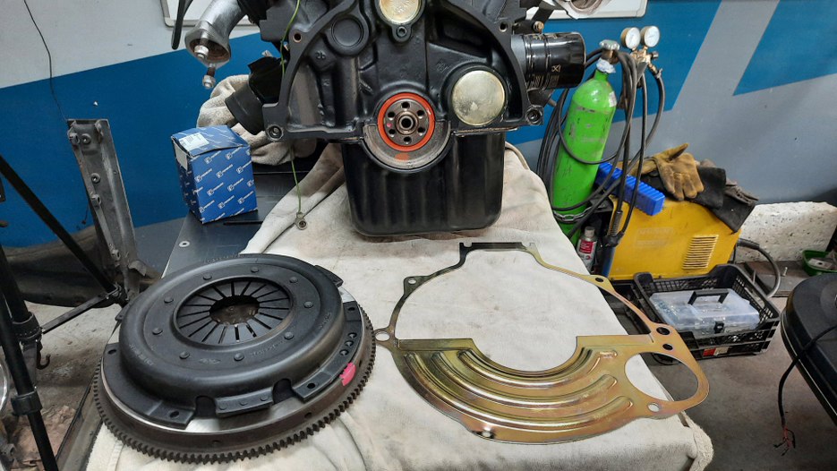 Po zdjęciu silnika ze stojaka mogę założyć blachę między silnik a skrzynię biegów, koło zamachowe i sprzęgło.