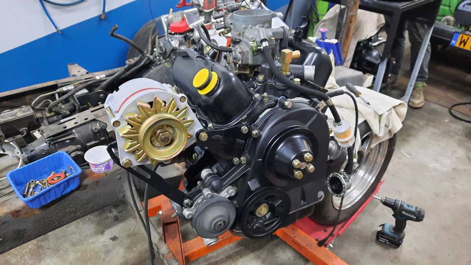 Z tej strony alternator. Koło pasowe pod wiatrakiem na razie ma zamiast wiatraka założone po kilka podkładek pod śruby - wiatrak założony będzie dopiero po włożeniu silnika do samochodu, żeby nie połamać go podczas transportu, przechowywania czy wkładania silnika.