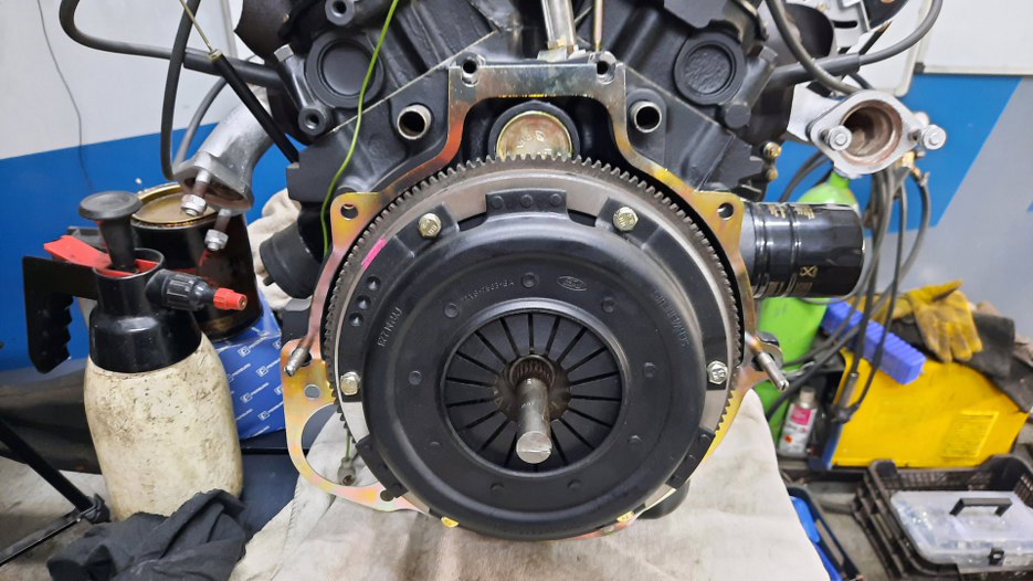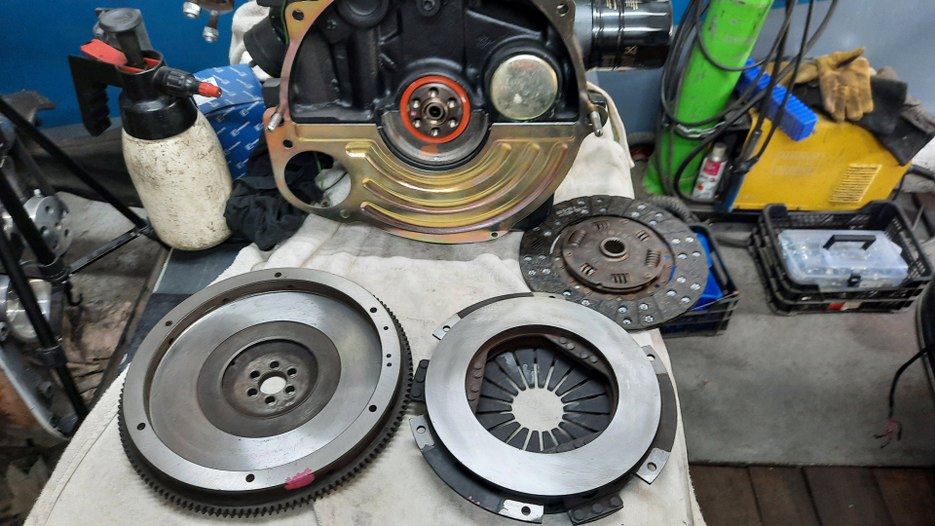 Po przykręceniu koła zamachowego mogę założyć sprzęgło. Tu mam wygodnie, bo mam kawałek wałka wejściowego ze starej skrzyni jako narzędzie centrujące tarczę sprzęgła.