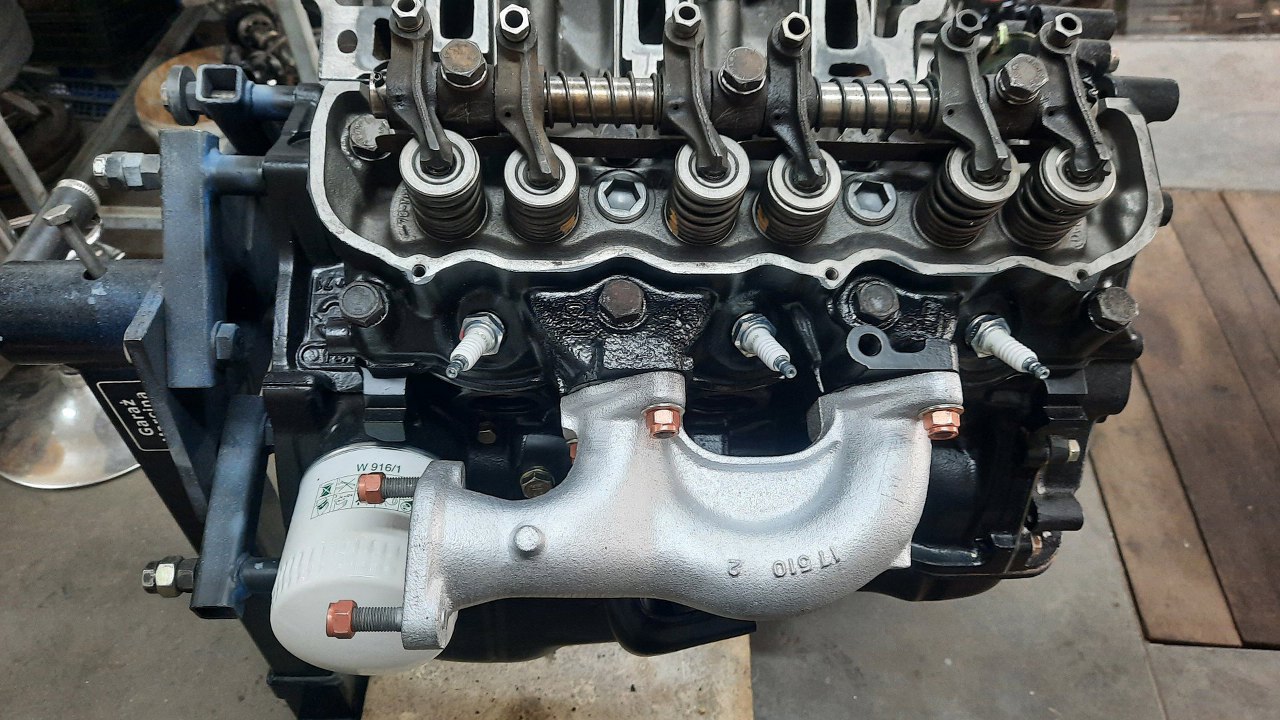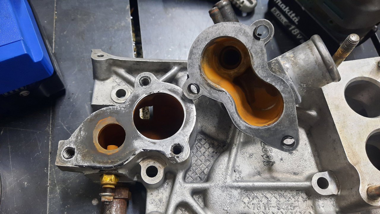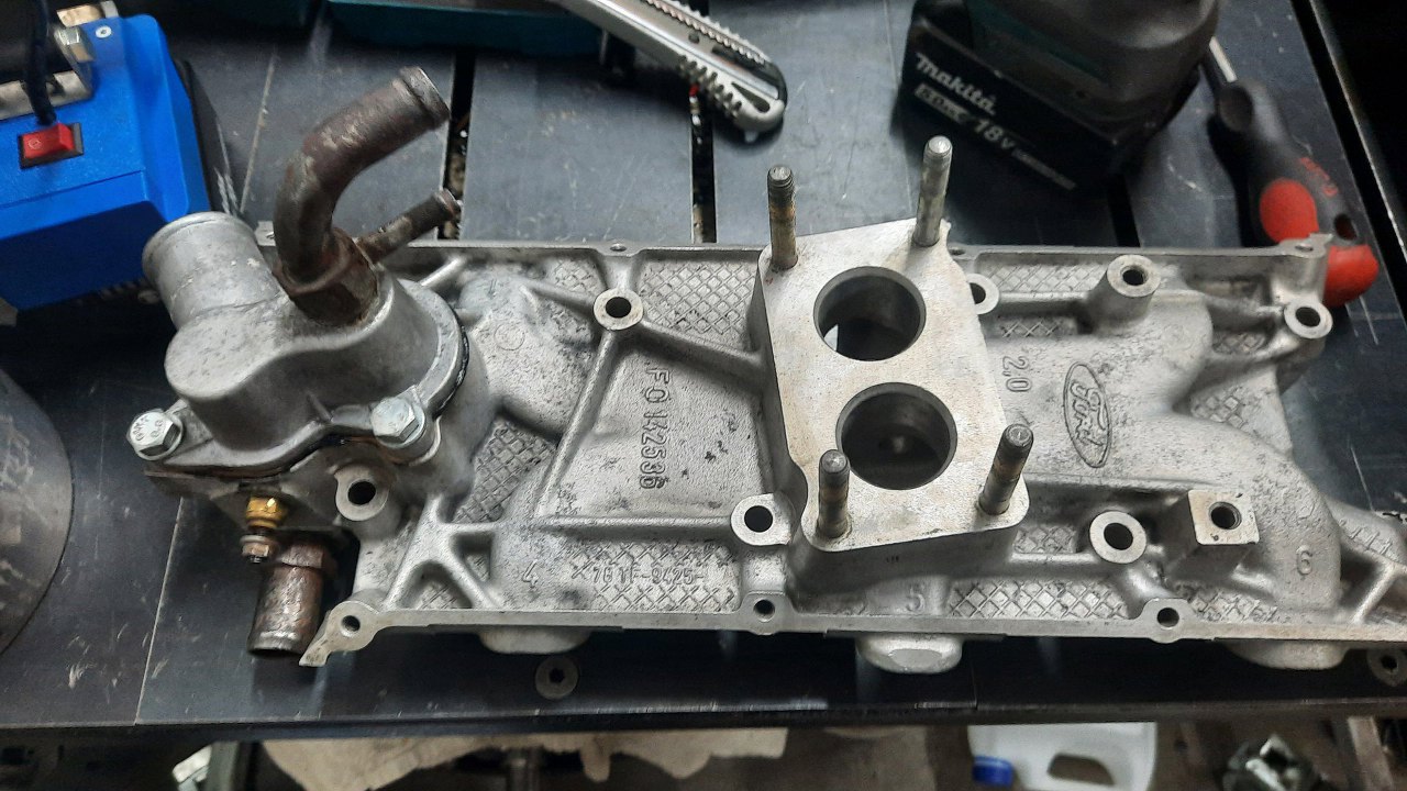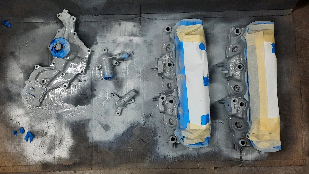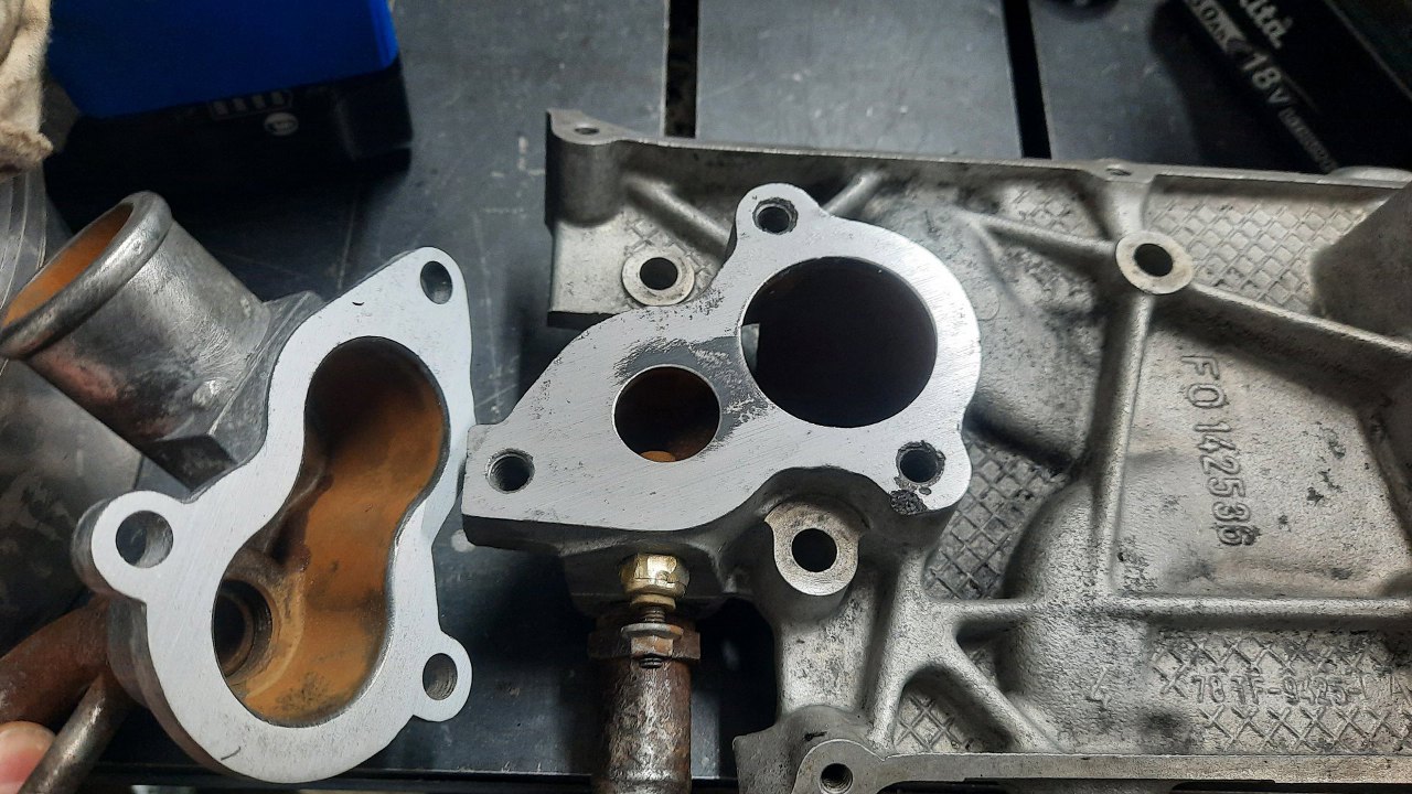 Kolektor dolotowy teoretycznie nie wymaga pracy, ale miałem go pomalować, żeby nie straszył na tak ładnym silniku. Podobno były problemy z gwintami śrub mocujących kolanko wodne, a i szczelność tego połączenia nie była taka, jak powinna.
