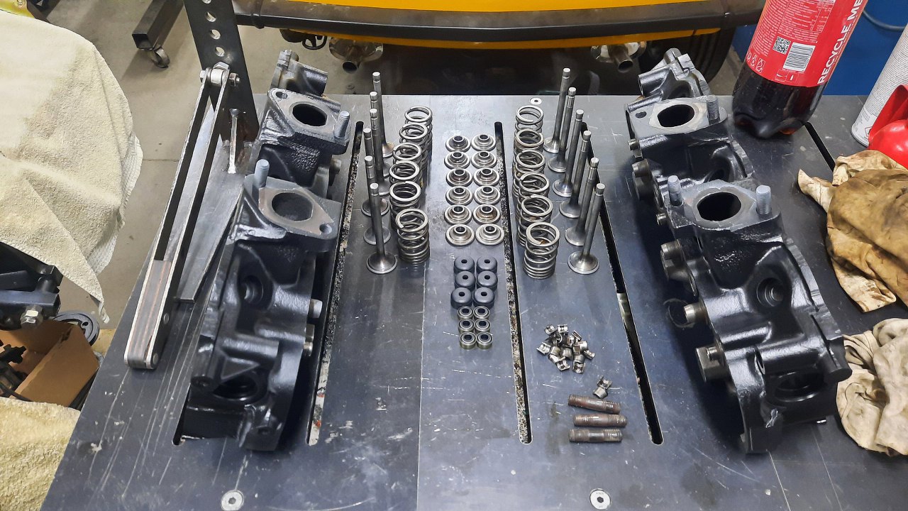 I oczywiście, jak zawsze, okazało się, że niektóre gwinty na śruby pokryw zaworów, są popsute. Musiałem wstawić w nich helicoile. Standardowo już wręcz w niewygodny sposób, bo z silnikiem do góry nogami, żeby opiłki spadały na podłogę, a nie do silnika.