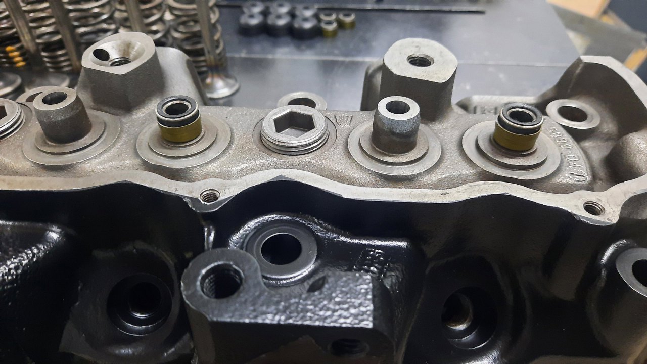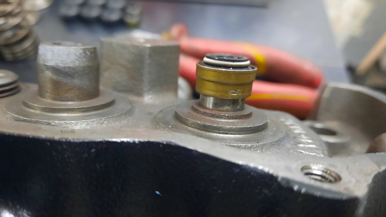Tylko coś mi się tu nie podoba. Oryginalnie ta głowica miała na obu zaworach uszczelniacze typu "parasolki", a ktoś kiedyś przerobił prowadnice zaworów ssących na uszczelniacze typu simmering. Po nałożeniu uszczelniaczy tak, jak zawsze, do końca, prowadnica rozszerza uszczelniacz, przez co w ogóle by nie działał.