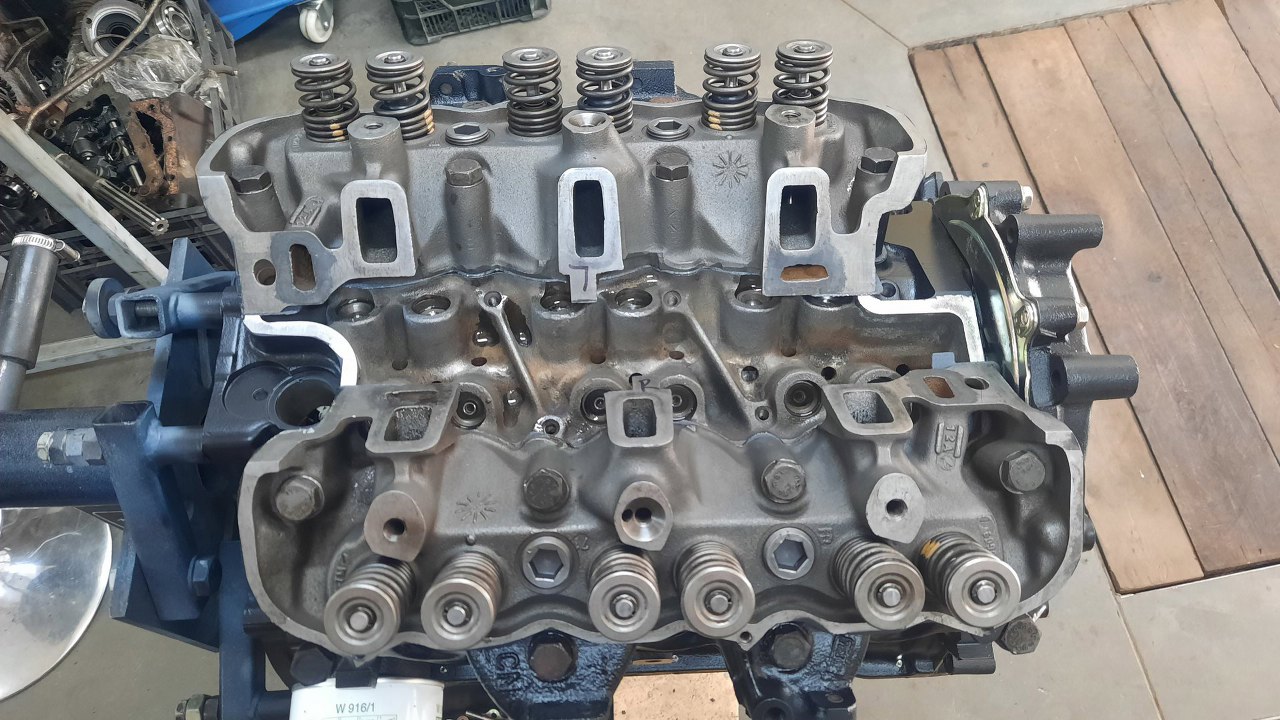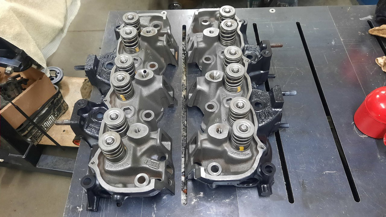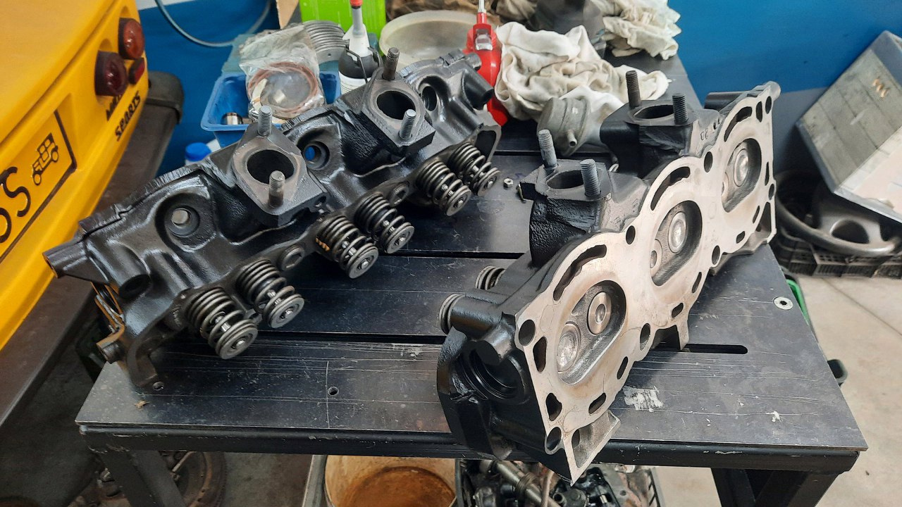 Głowice wymagają w sumie pracy - są nieco zapadnięte gniazda zaworowe i podejrzewam, że i prowadnice są do wymiany, ale w tej chwili nie ma na to zni budżetu ani czasu. Krzysztof wziął je do domu i po prostu dotarł zawory do gniazd. Pamiętaj, że ten silnik miał słabą kompresję, więc chcemy to poprawić. Głowice z drugiego silnika były w gorszym stanie. Przy okazji malowania głowic od razu psiknąłem też pokrywki termostatu i nową pompę wody.