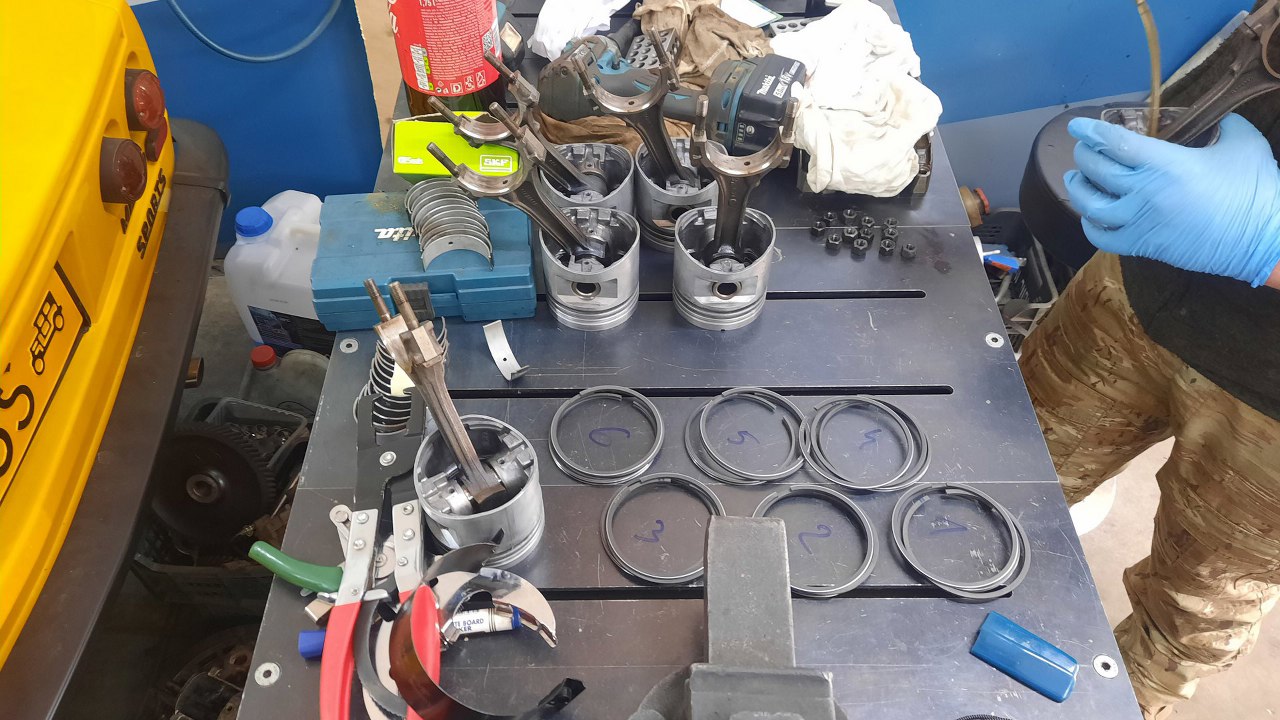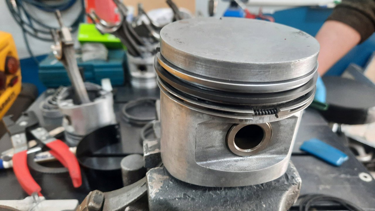 Wreszcie wróciły tłoki z obróbki. Okazało się, że pierwszy rowek na pierścień w każdym z nich był już mocno wyrobiony. Zostały przetoczone pod większy wymiar i odpowiednio dobraliśmy pierścienie. I praktycznie wszystkie pierścienie po sprawdzeniu luzu na zamku nie miały go w ogóle. Wszystkie. Każdy z nich trzeba było przeszlifować, żebymiał odpowiedni luz.
