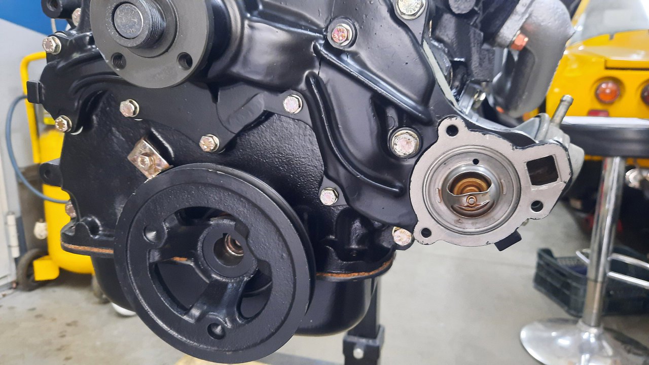 Zakładam też pompę wody, koło pasowe i termostat.