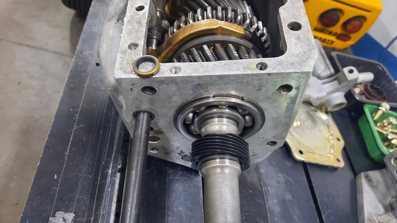 W międzyczasie przyszły uszczelniacze skrzyni, więc mogę złożyć skrzynię nieco bardziej. Na zdjęciu uszczelniacz wyjścia pręta zmiany biegów ze skrzyni - zaraz trafi na swoje miejsce w obudowie. Na wałku wyjściowym widać założoną zębatkę napędu prędkościomierza.