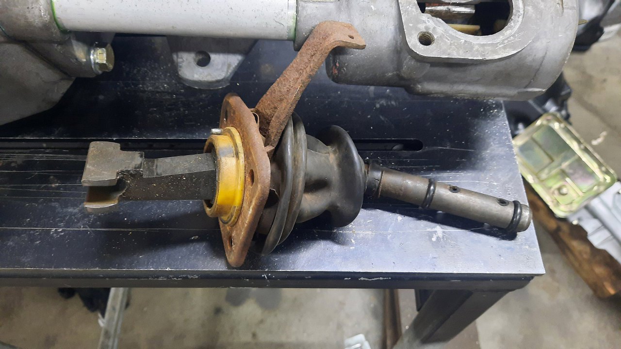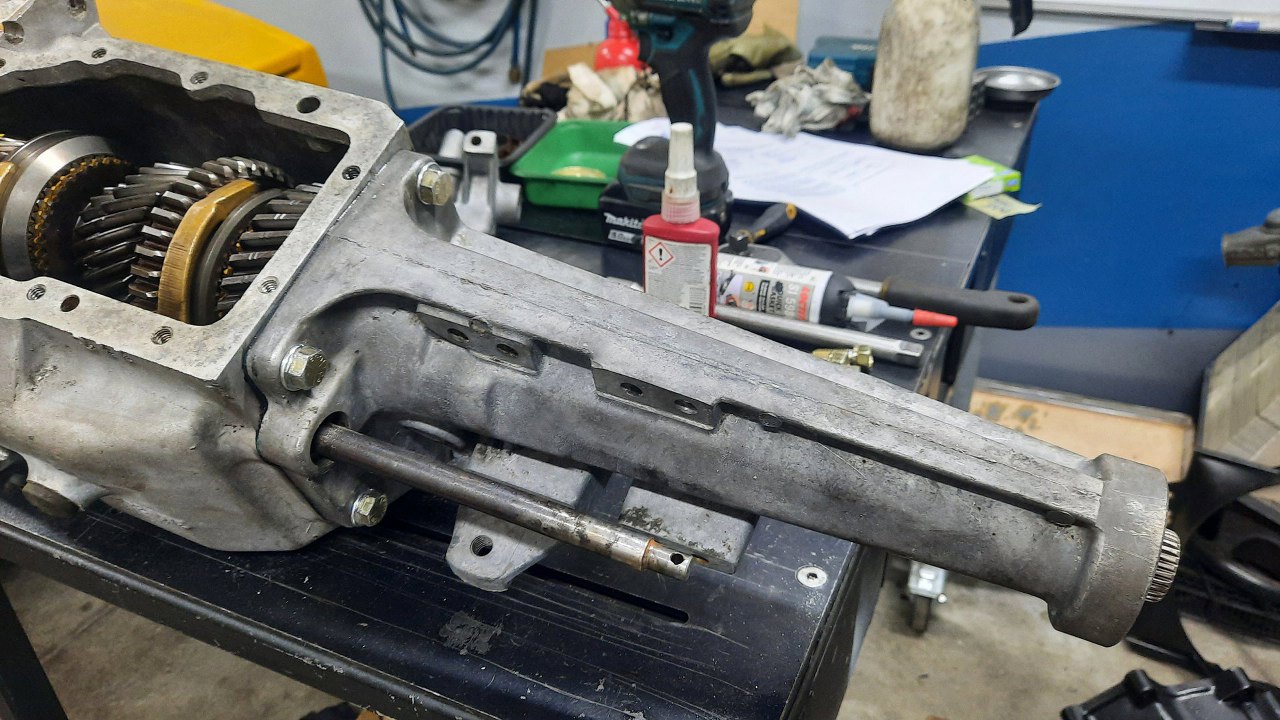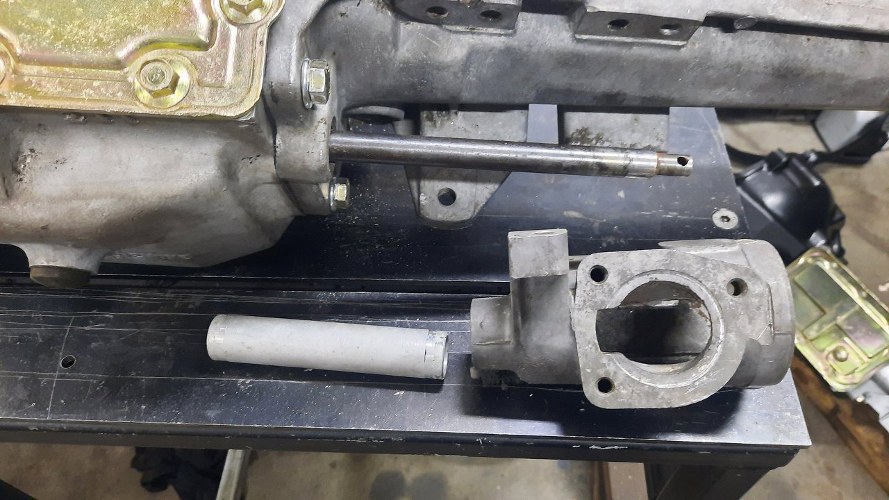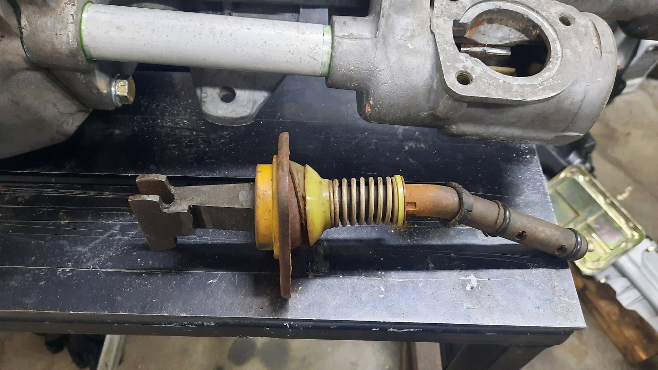 Ta część też jest od ciut innego modelu skrzyni - pordejrzewam, że od pick-upa. Podniesienie jej punktu mocowania powoduje, że możemy dać bardzo długą dźwignię i będzie miała w miarę normalny skok - idealnie pod pickupa. To niestety nie pasuje pod tą obudowę. Rozwiązanie jest dość proste - trzeba dorobić dystans pomiędzy te dwa elementy. Wszystko będzie działać jak trzeba, a gratis dostaniemy tzw. short-shifter :). Tą przeróbkę też jednak odkładamy na kiedyś.